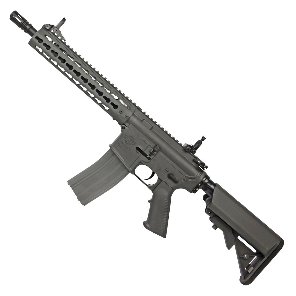 The CM15 KR-Carbine from G&G was made as part of the Combat Machine series, which aims to provide high-quality replicas at a good price. The main factor allowing to reduce the price is the use of a body of high-quality glass fiber reinforced plastic instead of metal. Made of plastic are the body, pistol grip, and Keymod rail system. The metal parts are the external barrel, a stock guide, sling mounts, and most of the small elements. The RIS rail allows you to attach any optical devices, while the retractable stock allows the CM15 to adapt your individual preferences. The AEG includes a set of foldable, mechanical flip-up sights. Batteries and charger not included.