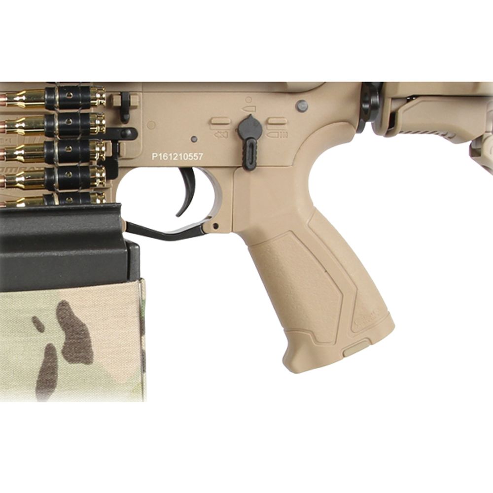 This G&G CM16 LMG (Light Machinegun) features a unique hybrid design for versatile style of combat. With the included bi-pod and massive 2500rd box magazine, this gun can be mounted to unleash a firestorm of suppressing fire. When you run out of ammo, fold the bi-pod up into a vertical foregrip and load in a standard M4/M16 magazine to take your LMG on the run. The M-LOK handguard and picatinny/weaver rails provide ampe room to attach laser sights, flashlight mounts, or optics to compliment your approach on the battlefield. The CM16 LMG has some impressive full metal internals, including a 25000rpm motor, 8mm gearbox, as well as a MOSFET and ETU which allows for programmable 3rd burst. A link of dummy rounds is also included to give the rifle an authentic LMG look.
