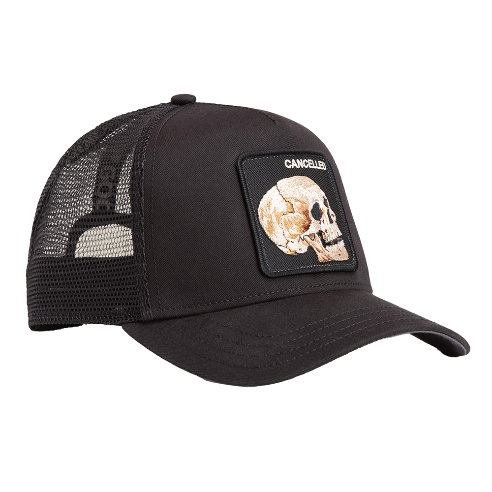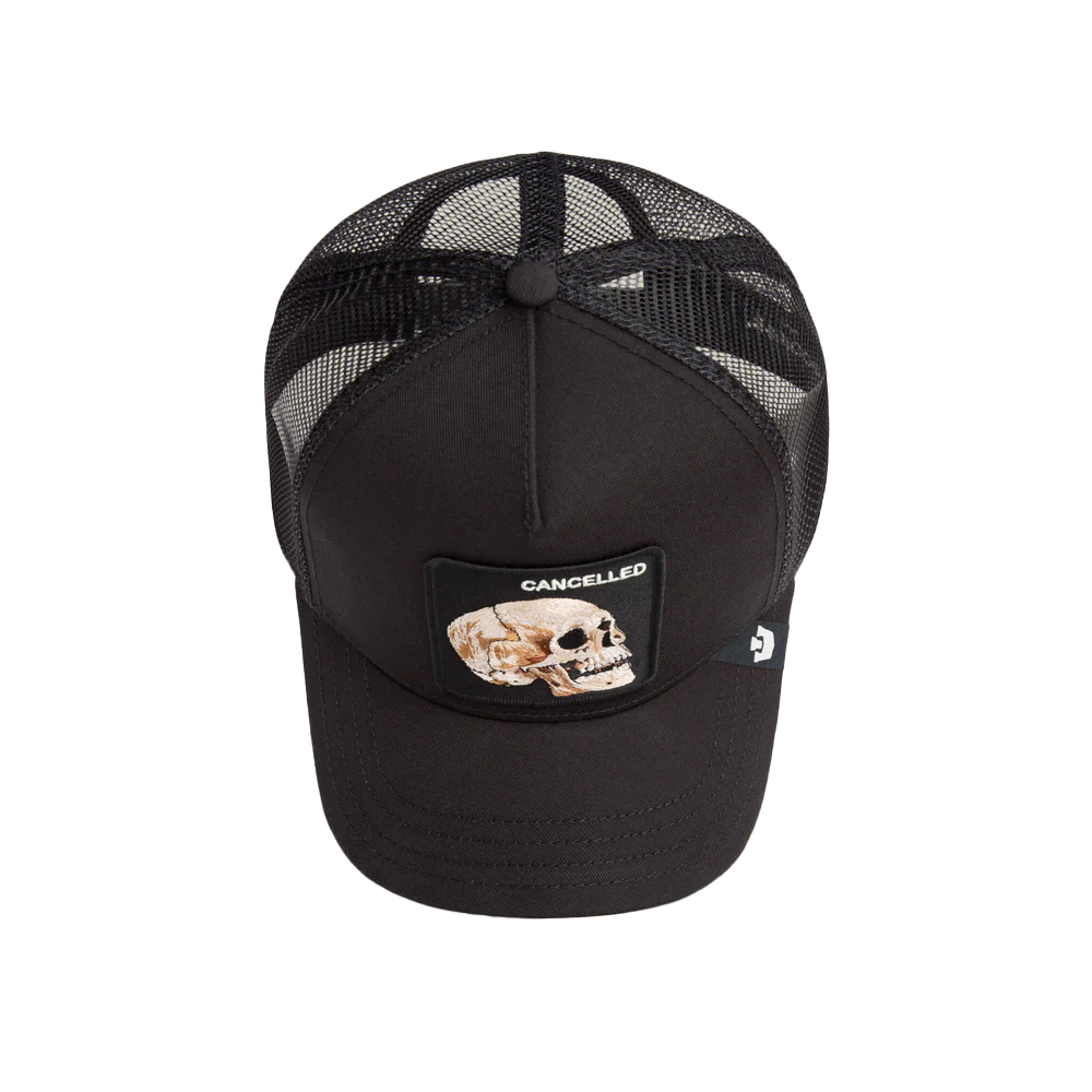 Goorin Bros The Cancelled Skull Trucker Cap features a bold embroidered skull patch with “Cancelled” text on a classic trucker silhouette. Built with a structured front panel and breathable mesh back, it delivers comfort, ventilation, and durability for everyday wear. The adjustable snapback closure provides a secure and customizable fit.