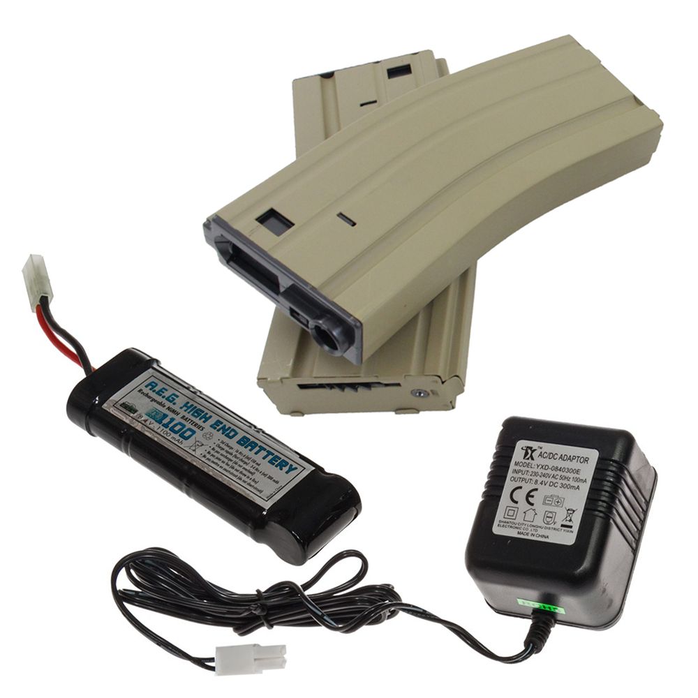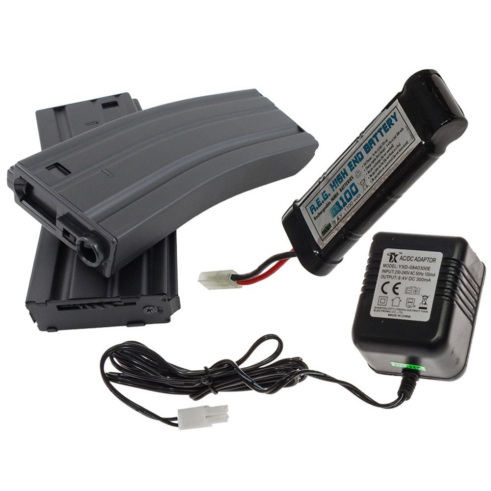 Features:Type: airsoft riflePower: electric (battery)Material: polymer and metalOverall Length: 797 mm (31.3 in)Weight: 2028 g (4.5 lb)Action: semi-automatic/full-automaticBarrel Length: 260 mm (10.2 in)Magazine Capacity: 350 roundsAmmo Type: airsoft BBs 6mmMuzzle Velocity: 374 FPS