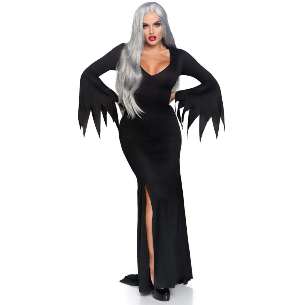 The Leg Avenue High Slit Floor Length Bodycon Gothic Dress is sexy, slinky and the perfect dress for any aspiring mistress of darkness. This sultry bodycon dress effortlessly embodies our favorite horror hostess with the classic tentacle bell sleeves, high leg side slit and plunging v-cut. Each curve hugging dress is made from a soft, stretchy polyester for a form-fitted look.