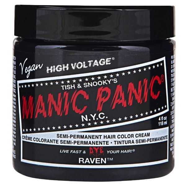 Our Raven™ has all the dark ferocity that any black color should, yet it is less likely to stain your hair like most other dyes. Additionally, unlike most black hair dyes on the market, our Raven™ does not contain the allergen PPD. Will you be buying other brands after trying this out? "Quoth the raven, 'nevermore'." For a matching black lip, try our Lethal™ Lipstick in Raven™ (Creamtone™ formula) or Nosferatu™ (Matte Kitten Colors™ formula). Vibrant color results are best achieved by applying to hair that has been pre-lightened with Manic Panic® Flash Lightning® Bleach KitsCream Formula Semi-Permanent Hair Color. Vegan Formula colors and conditions hair.Manic Panic® Hair Color is ready to use, do not mix with peroxide. Vegan ingredients. PPD and ammonia-free.Tested on celebrities, not animals™