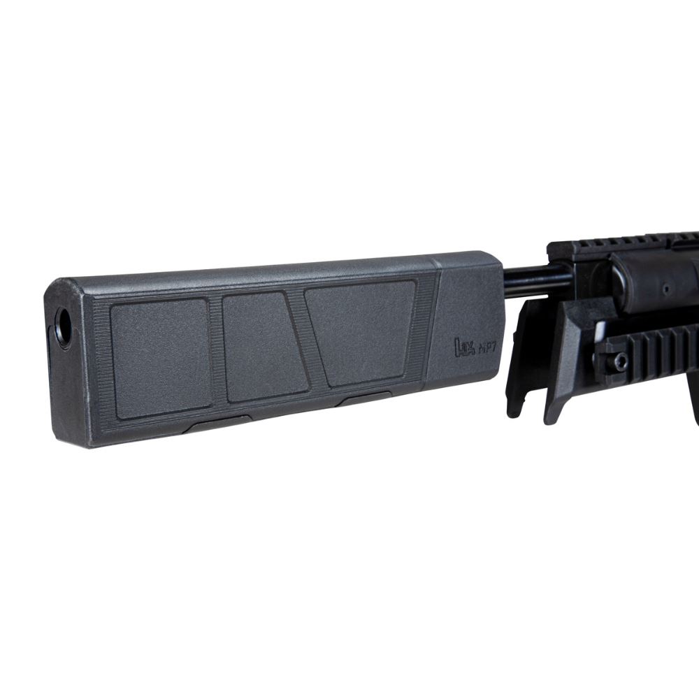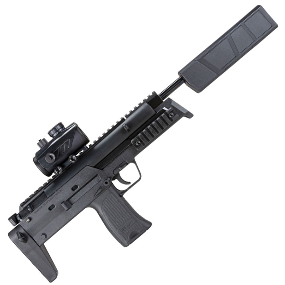 Meet the “civilian version” of the centerfire MP7. As a single-shot, .177 caliber break barrel airgun, this version does an admirable job of engaging feral soda cans and similar plinking targets in backyard ranges. The faux suppressor is useful for providing an easier cocking effort. With a maximum Muzzle Velocity of 490 FPS, there’s no need for any actual suppressor capabilities as the report will be very quiet! The MP7 has plenty of Picatinny rails for mounting accessories; they’re on both sides and top of the gun. Rather than the iron sights of the MP7A1, this pellet gun is bundled with an Axeon Optics 1×30 red dot sight. This features 11 levels of brightness for various lighting situations, a 5 MOA red dot, as well as being elevation and windage adjustable. The wire stock comes collapsible meant it’s compact enough to be used by properly-supervised children and can become long enough to give adult shooter proper length of pull.