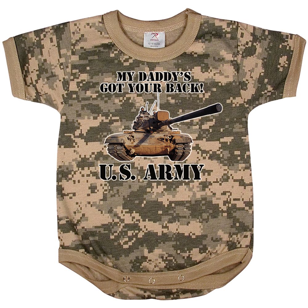 Infant Army Digital Camouflage O Got Your Back One Piece Bodysuit is designed from 100% cotton and is easy on your little one’s skin. It features a snap bottom closure. This one piece suit is available in sizes from 3 months to 4 T. It sports a digital camouflage print with words "My Daddy’s Got Your Back" printed on it. It also features a print of a Army Tank with the words "U.S Army" mentioned right below it. It is short-sleeved and has a round neck. It sports a mud brown lining on the neck, sleeves and on the snap-bottom. It also sports a white label on the inner side of the neck