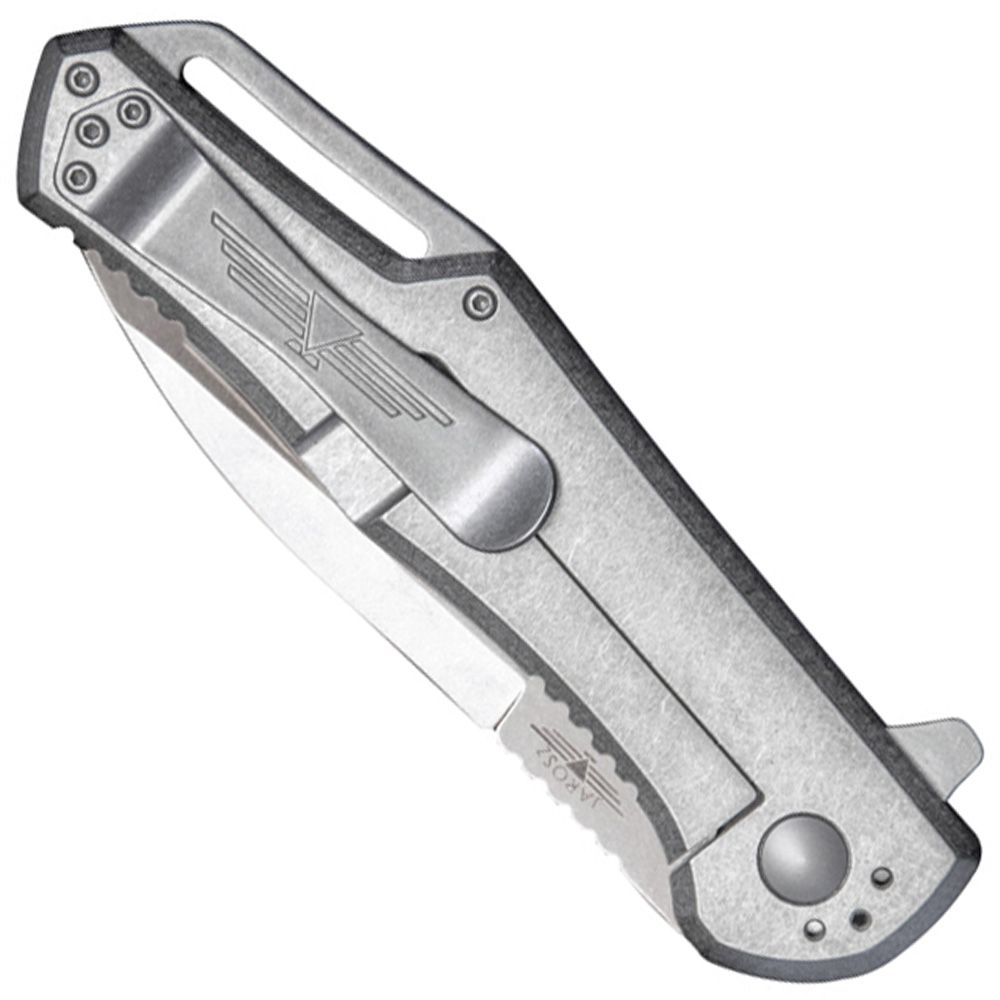 The Jarosz Flipper Folders are made of AUS8A stainless steel. The handle is G10 and the backside of the knives are titanium. The 7508 has a wharncliffe blade shape.