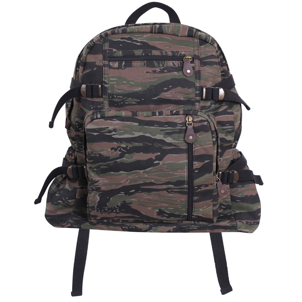 Jumbo Vintage Canvas Backpack is a classic backpack constructed with a vintage washed cotton canvas material. The pack features 1 large main compartment ideal for books & supplies, 3 outside zippered pouches & 2 elastic side pockets with tie down straps, great for accessories and water bottles. In addition, the canvas bag also features padded adjustable shoulder straps and a top carry handle. Jumbo Canvas Backpack measures 18" x 13.5" x 7". also offers a more compact version of this backpack as well.