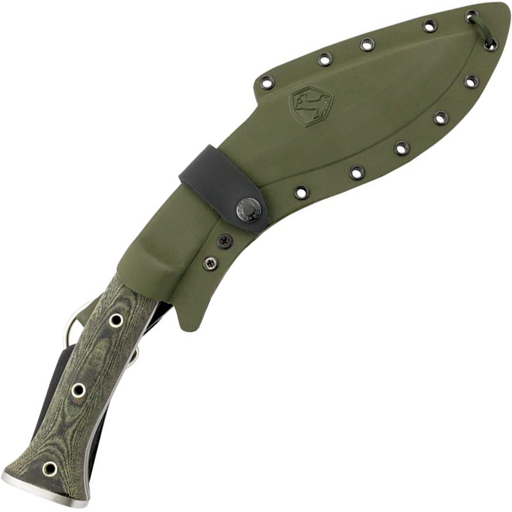 The K-TACT Kukri Knife features a 10" 1075 blasted high carbon steel blade. The knife is named after survival expert Alan Kay, season 1 winner of "Alone" on the History Network. Every edge is hand finished and honed to razor sharpness. The Micarta handles enhance both the look and function of this knife while delivering durable phenolic performance. The included sheath is made from high-quality Kydex with a leather belt loop, designed by 710 Custom Sheaths.