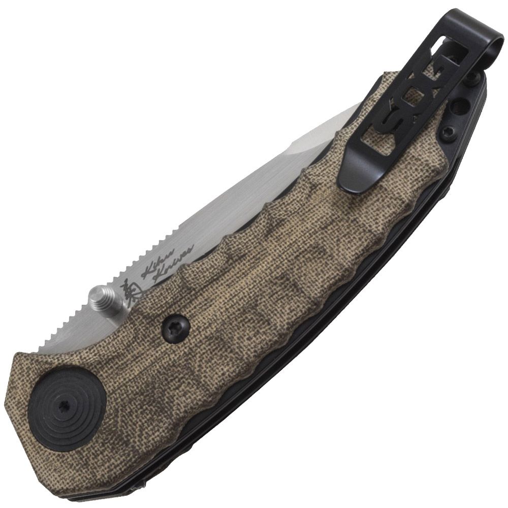 Building upon SOG's long tradition of working with and honoring Japanese knife makers, SOG partnered with Kiku Matsuda, one of the foremost tactical knife designers and blade grinders in Japan, to produce a line of knives. Together, Matsuda's decades of experience in blade grinding and making fixed blade knives and SOG's production experience has created one of the most unique, striking, and functional blades available. Through this collaboration, Matsuda and SOG have won awards and continue to drive innovative and functional knife designs. This folder features a quick SAT spring-assisted, high-end VG-10 stainless steel blade showcasing Matsuda's trademark and distinctive blade grinds. The handle is constructed using full length stainless steel liners with elegant linen Micarta slabs that are rugged, easy to clean, and look better the more it is used. The SOG Kiku Assisted blade performs just like any workhorse knife, but it does so with more balance, class, and comfort.