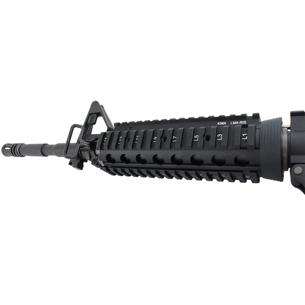 The KWA LM4 RIS Professional Training Rifle is an AR style gas blowback airsoft rifle. It features a full metal construction, including an aluminum alloy receiver, rail system, magazine, and steel reinforced bolt carrier for strong reliable feedback. Powered by green gas, the LM4 fires up to 390 FPS at 13 rounds per second. This rifle was built to MilSpec specifications so that operators can customize it with their own stock, pistol grip, and trigger guard. The blowback system has a functional bolt catch, forward assist, and charging handle for added realism during combat. It comes with a low-cap 40-round magazine and a plunger for easy loading.