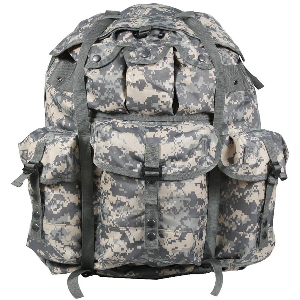 Made of sturdy 600 denier polyester, GI Type Large Army Digital Camo Alice Pack with Frame is ideal for military personnel, hikers, campers, fishermen and outdoor enthusiasts. It features heavy padded shoulder straps, which make it comfortable to carry heavy loads for long distances. The bag boasts of three large vented outside pockets with closure, which let you keep army supplies safely and conveniently. It comes with durable anodized aluminum frame and waterproof lining, which add to its durability and longevity. Its heavy padded kidney pad ensures comfort for long treks. It is a great pack for keeping clothes and lightweight gear.