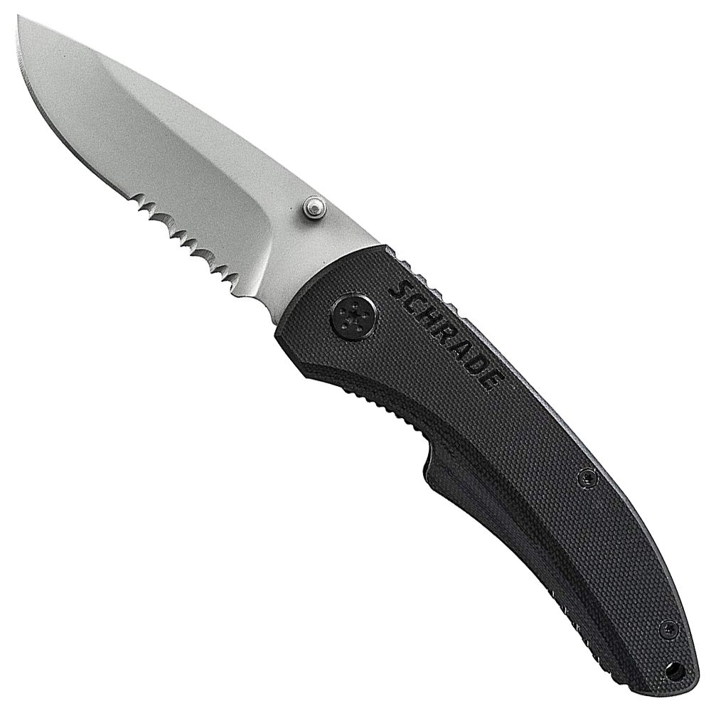The Schrade 100 Series of utility folding knives features G-10 handle paired with a stout liner lock mechanism and a blade made from 9Cr14MoV high carbon stainless steel. These lightweight designs make perfect EDC carry options and have non-reversible pocket clips set up for tip down carry.