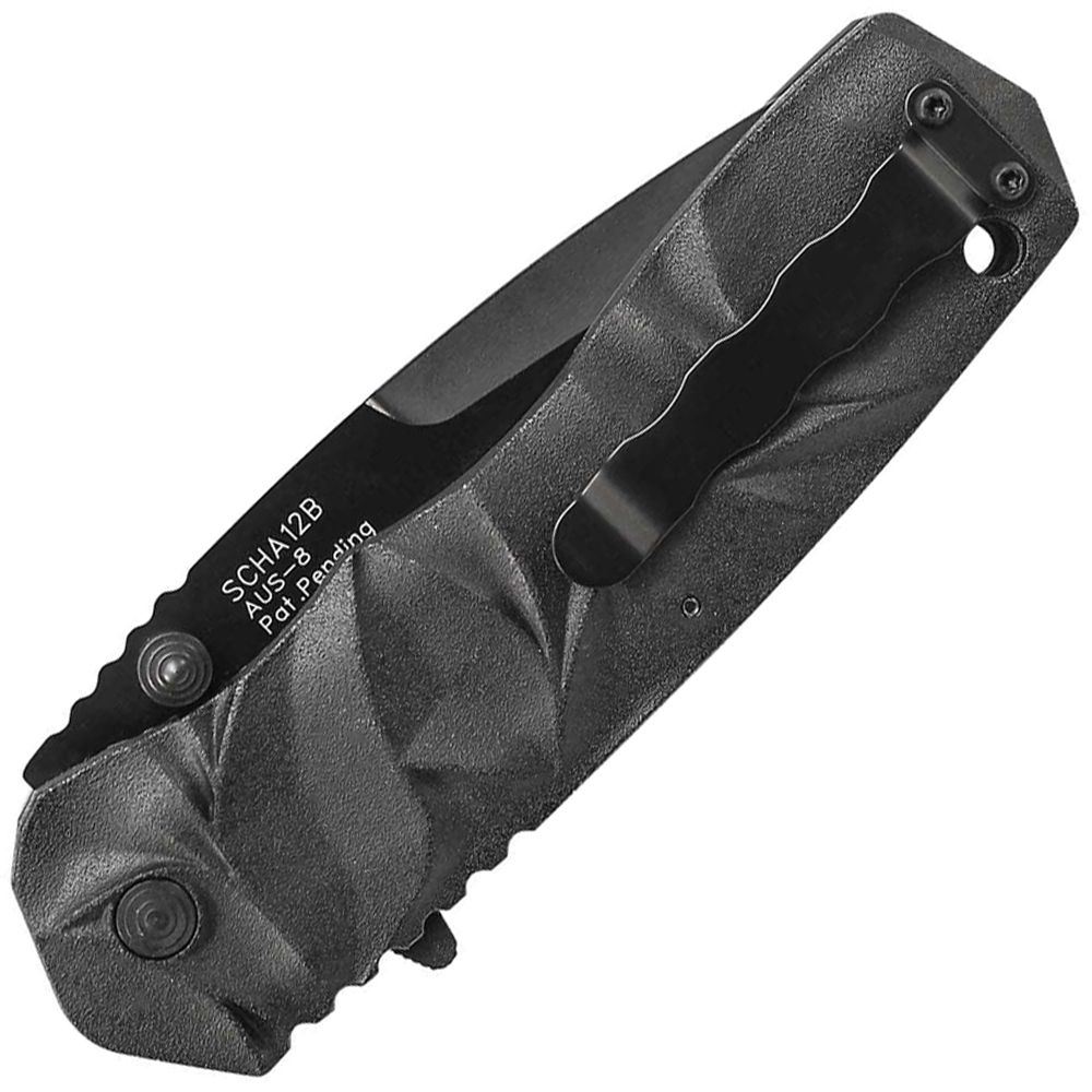 Schrade® M.A.G.I.C. Dual Action Manual & Assisted Opening Liner Lock Folding Knife, Black AUS-8 High Carbon Stainless Steel Partially Serrated Drop Point Blade with Ambidextrous Thumb Knobs and Thumb Ramp Jimping, Black Coarse Coated Aluminum Handle with Manual/Assist Switch and Thumb Jimping, Lanyard Hole, Reversible Pocket Clip.