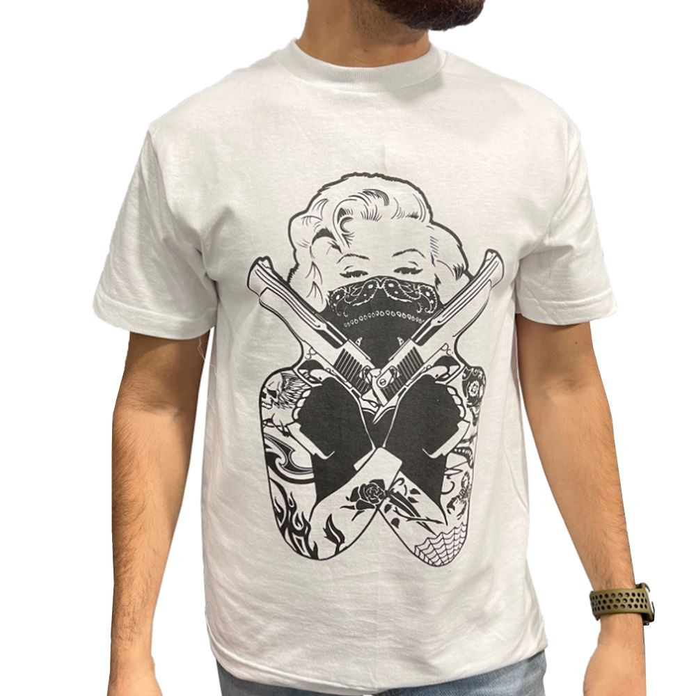 Get this Marilyn Monroe Gangsta Pose T-Shirt Custom Tee that features a hot Marilyn Monroe with her arms crossed holding two guns up in the air. She also has a sleeve of tattoos on both of her arms and neck with a bandanna covering her face.