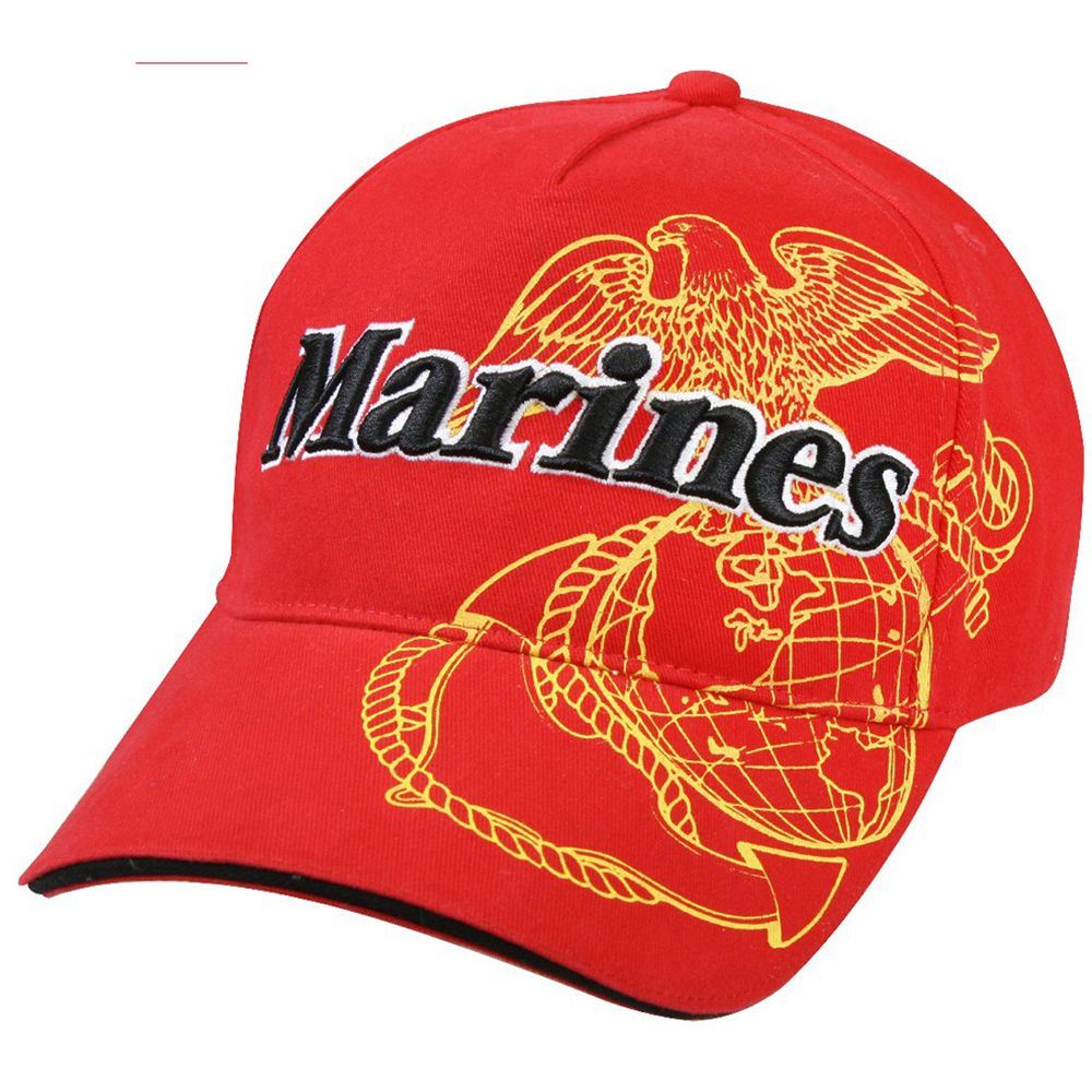 100% Brushed Cotton TwillCap Color Is RedWith Marines Embroidered In Black On Front With Eagle Globe And Anchor Printed On Front And Onto Brim In GoldSandwich Brim - BlackHook And Loop ClosureOfficially Licensed By The U.S. Marine Corps