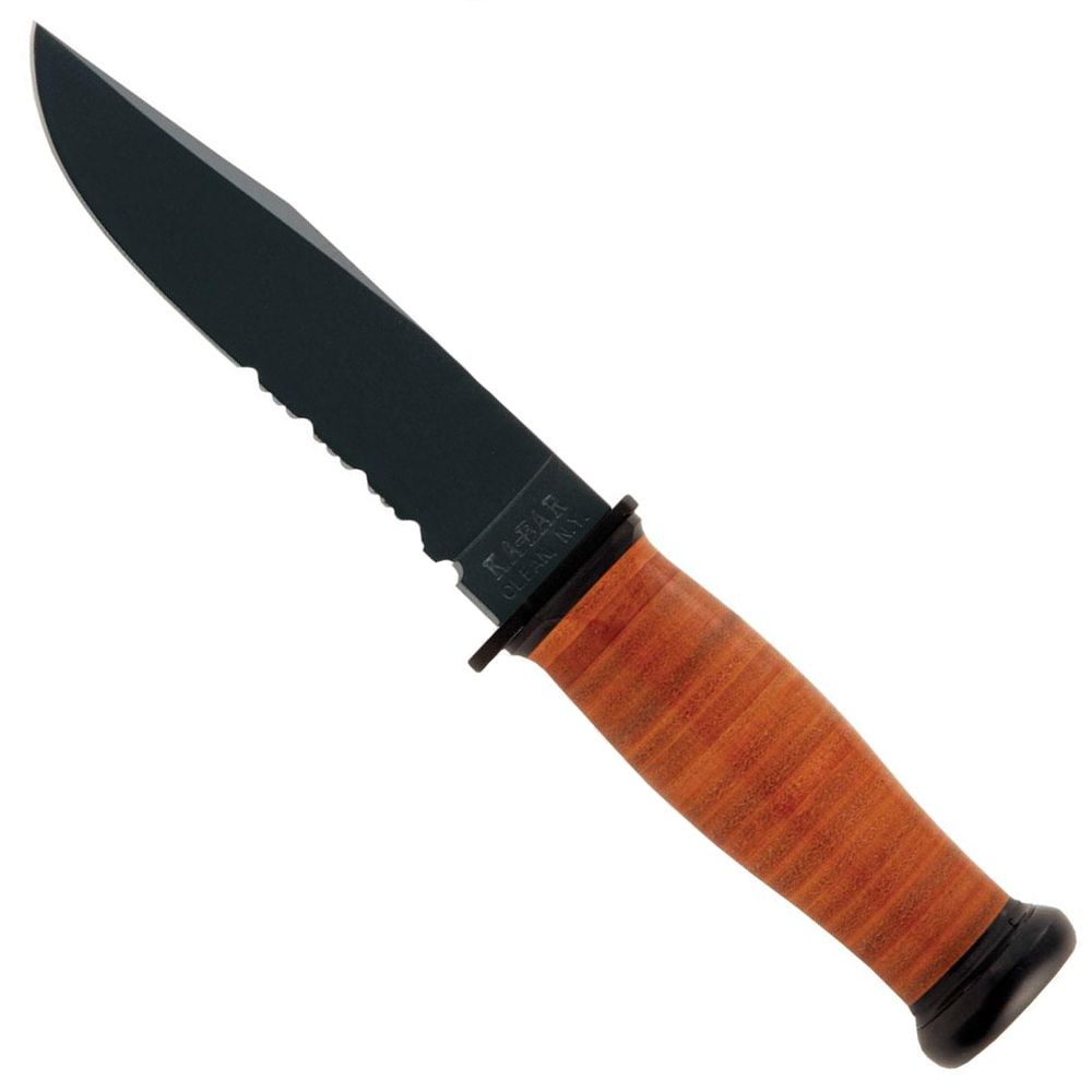 A remake of the ever-popular and sought-after knife issued to the Department of the Navy during WWII, the Mark I features a non-reflective black blade that is epoxy powder-coated. Tests prove the finish is more durable than ever. The classic oval shape of the original KA-BAR remains and has been modernized with a material nearly impervious to sweat, chemicals, water and wear - Kraton G. Tang stamped USN. MOLLE compatible hard plastic sheath included.