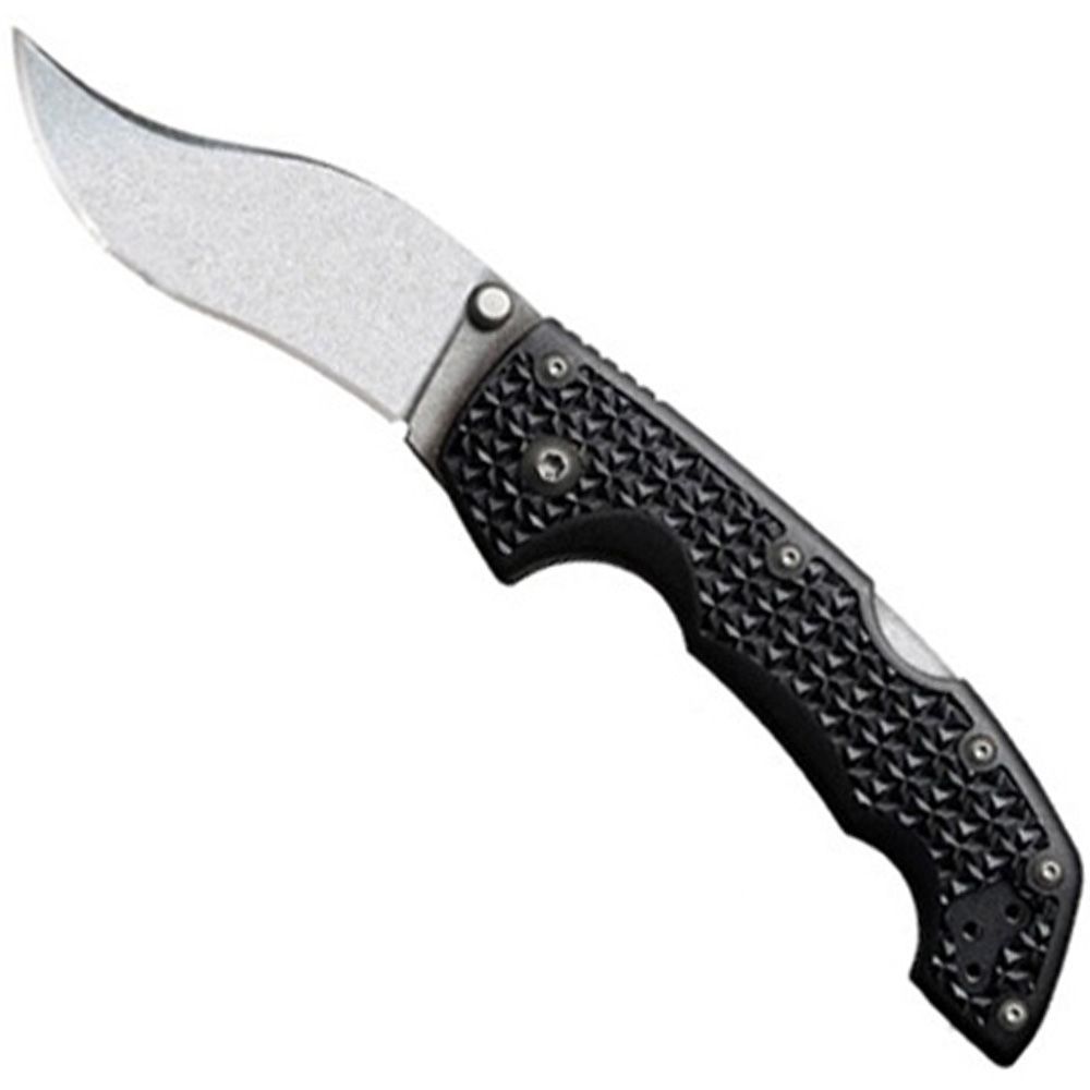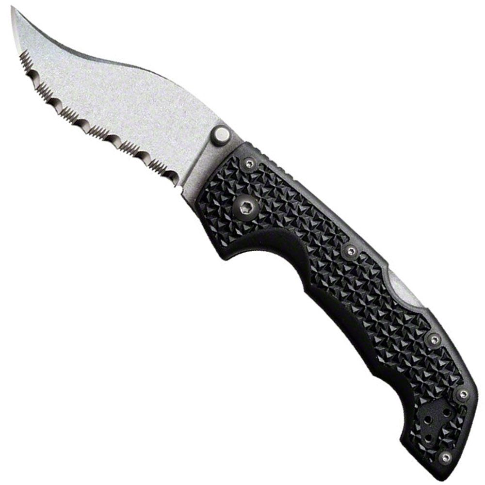 The Voyager is ounce for ounce, far stronger than 99.9% of other folders. Each knife features precision made parts with a stiff spring and Cold Steel's Tri-Ad lock mechanism which is arguably the strongest, most reliable, low maintenance lock in the world! The thick, extra wide blades are made from Japanese AUS 8A steel and meticulously ground to a thin edge for maximum shearing potential. This thin edge also allows us to hone each blade to astounding sharpness. And, because of the high carbon content of the steel, and their near perfect heat treatment, you'll find this sharpness last a surprisingly long time. The Voyager Series also offers all the other latest refinements in lock-back construction including lightning quick, one-handed opening, state of the art mechanical fasteners, massively oversized pivot pins that are fully adjustable and properly hardened, and dual stainless steel pocket clips for ambidextrous carry and deployment. The Grivory handles feature 6061 heat treated aluminum liners for the utmost in strength and stiffness and are ergonomically designed to afford a wide array of grip options including the palm reinforced forward grip for which they are particularly well suited. Grivory is unparalleled as a handle material as it is considerably stronger than Zytel and, when deeply textured, offers a terrific non-slip grip. As an added bonus, it's impervious to moisture and won't crack, warp or shrink and remains remarkably resistant to abrasion or discoloration. As tools these lightweight, super sharp knives are appropriate in almost any environment from hunting and camping to hiking and general utility chores. They can also readily fill specialty functions such as a boat or river knife, chute knife or police/military and survival/rescue applications.