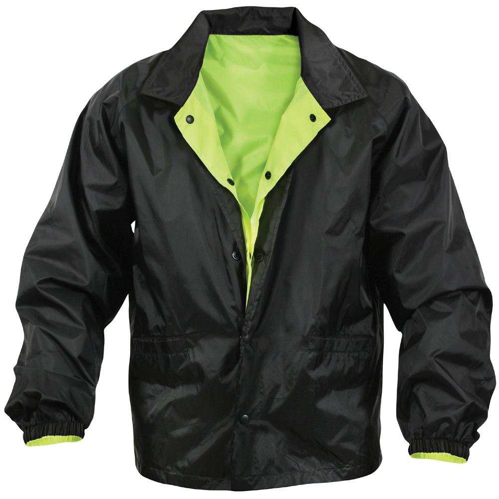 Reversible Hi-Visibility Forced Entry Yellow Black Lightweight Uniform Jacket is made from 100 percent nylon. The outer shell is made of nylon. It is a reversible jacket with one side made of complete black and other side having hi-visibility yellow reflective tape on it. The jacket has self-collar which means the black side of the jacket having black color collar and the yellow side of the jacket has yellow color collar. It has five snap-up front closures with black finish. The elastic wrist cuffs make it perfect fit on the wrist. The drawstring bottom makes it right for your hip size. It has two big size pockets on the back of the jacket.