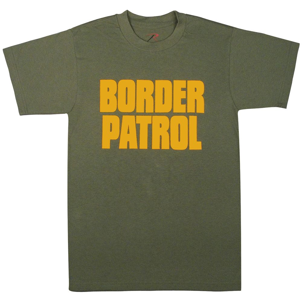 Mens 2-Sided Border Patrol features a OD cotton poly t-shirt with yellow/gold lettering stating "Boarder Patrol".