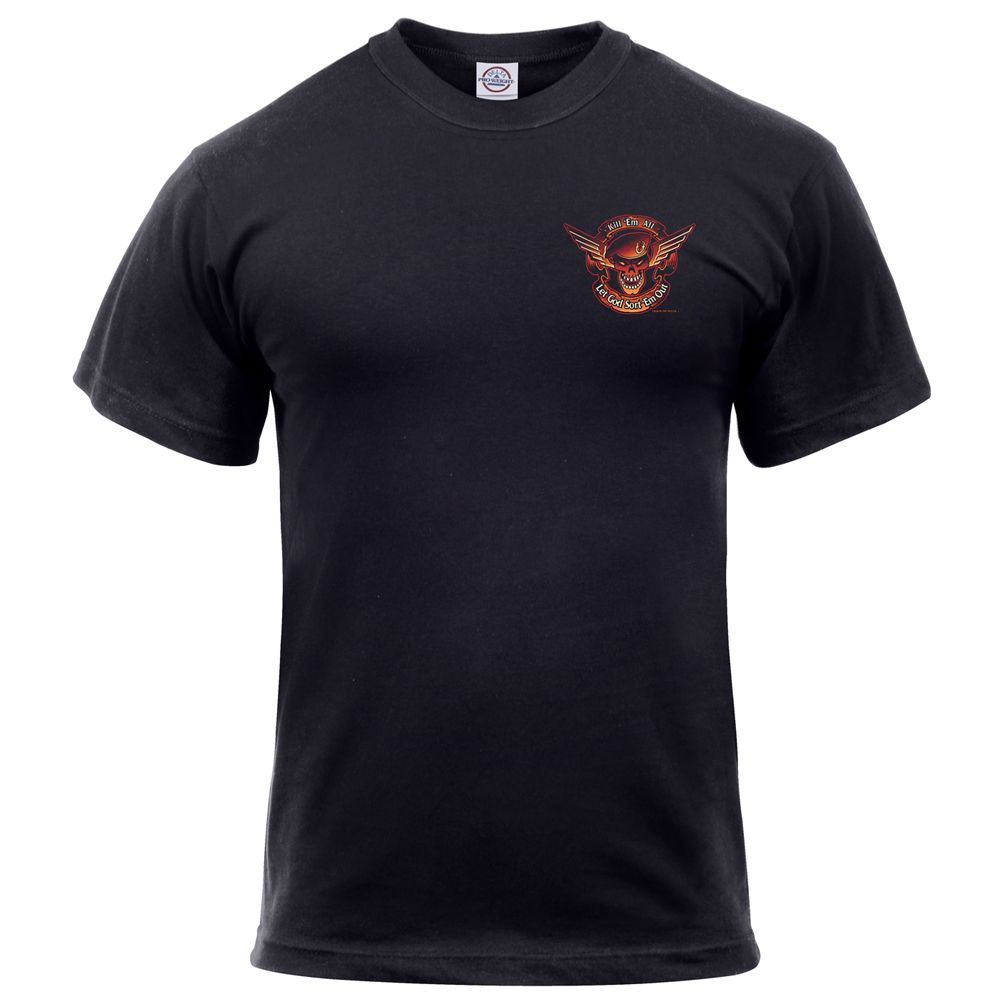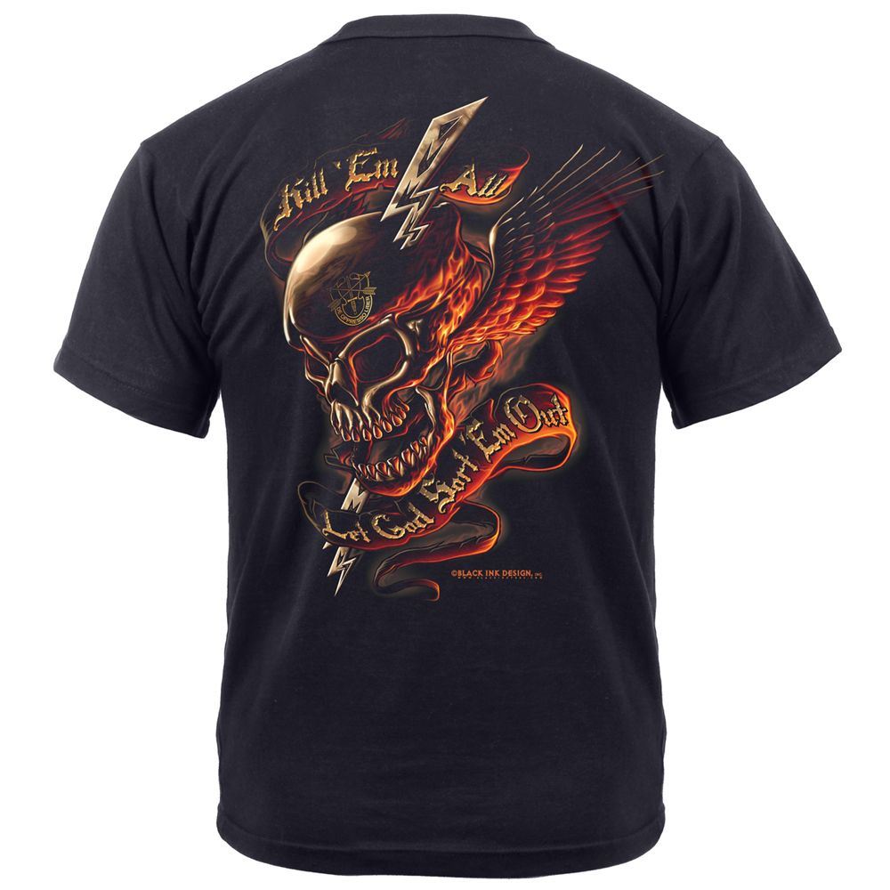 This is a bright, two sided tee. The back has a big picture of a ‘smiling’ skull, which has wings; is wearing a beret, and has a lightning bolt going through, which is depicted by flames. There is also a message saying, ‘’Kill 'Em All Let God Sort 'Em Out.’’ The front also has a skull printed. This is a smaller picture, with the same message. The material of this tee is 100% cotton, which is preshrunk. Extremely comfortable, it is great for informal gatherings or sports. Since it is made of strong fiber, it is durable and easy to handle.