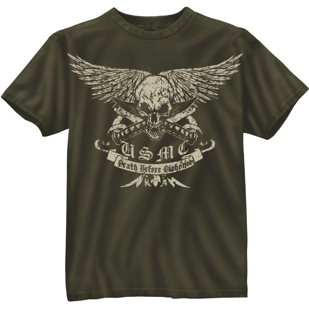 This is a comfort fitting T-shirt in olive drab. The material used is 100% cotton (ring spun), which means it can ‘breathe’ well, thus providing the best comfort. The design is great too. There is a skull with large wings and two knives across its mouth. The slogan says ‘USMC Death before dishonor’. The print is in white, which makes it stand out against the olive drab background. As one would expect, this heavy duty T-shirt is easy to maintain. Since it goes well with most of the leg wears among men and women, it’s a great wear to have.