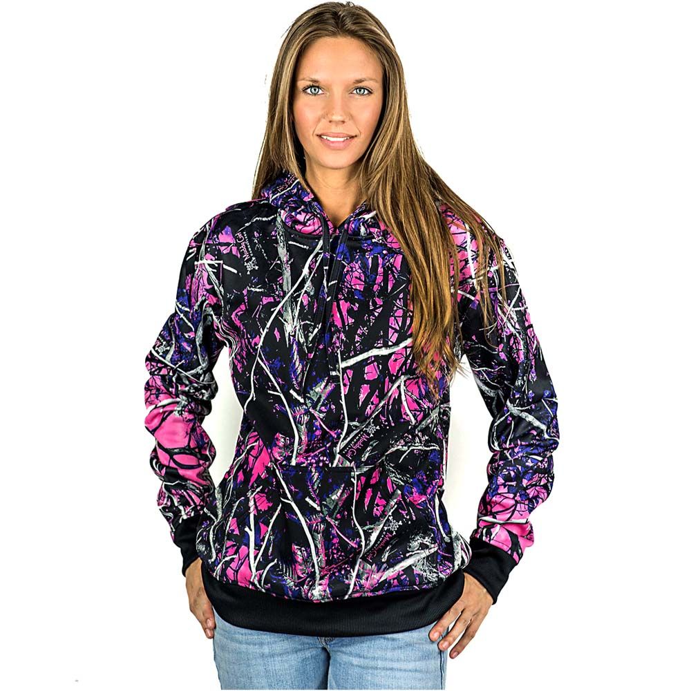 Be ready to get tons of compliments when wearing this vibrant Muddy Girl Moon Shine Camo Hoodie. It's a fashionable, stylish and practical piece to add to your outdoour wardrobe. This camo hoodie does even more than make you look great. Girls who take care of their health or spend a lot of time outside will see its true value during cold season and cool summer evenings. Just put your hands in the front kangaroo pocket, tighten the hood drawstring and enjoy walking, hiking, socializing or trekking, even on a cold day. Stretchy ribbed cuffs and waistband will keep the wind out.