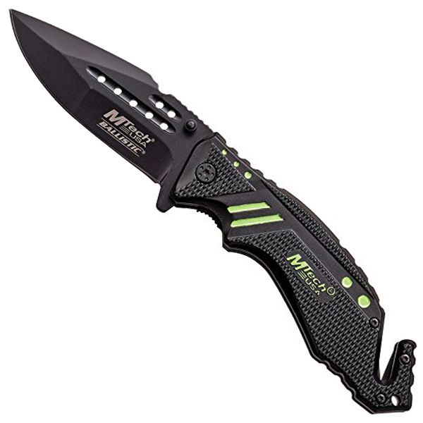3.35" Black Stainless Steel Blade3mm Thick Blade4.75" Black and Green Twice Anodized Aluminum Handlewith Dual Blades Seat Belt CutterIncludes Black Pocket Clip.