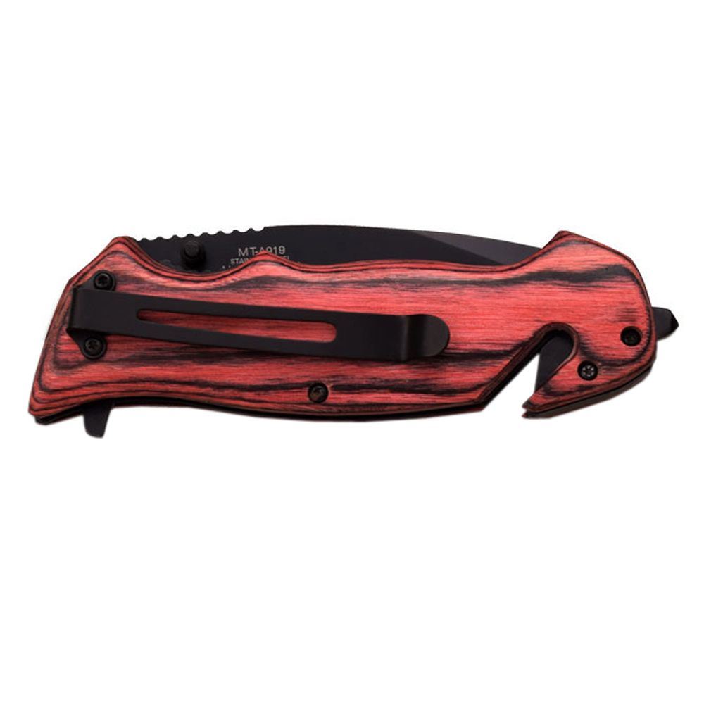 3.4" 2.8mm Thick, Stainless SteelBlack Coated Half Serrated Blade4.76 ClosedSpectrum Pakkawood HandleIncludes Black Pocket Clip.