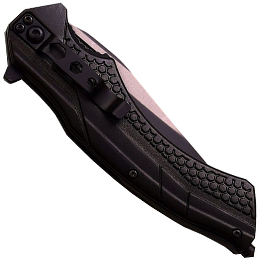3.75" 3mm Thick Blade, Stainless SteelBlack and Sand Blast Finished Blade5" ClosedGreen and Black Two-Tone Aluminum Handle Includes Pocket Clip and Glass Breaker.