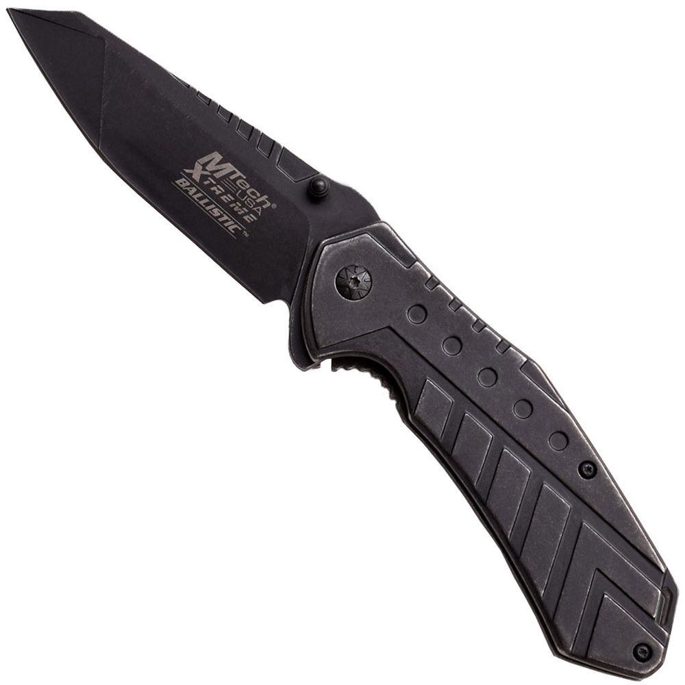 The M-Tech Perpetrator is a folding knife for everyday carry. Easy to use and hold, makes this the perfect knife for your daily needs. The stainless steel, Reverse Tanto style blade has dual thumb studs and a flipper. The handle is made of black grooved stainless steel. It features a lanyard slot and a frame lock. It comes with a stainless steel pocket clip.