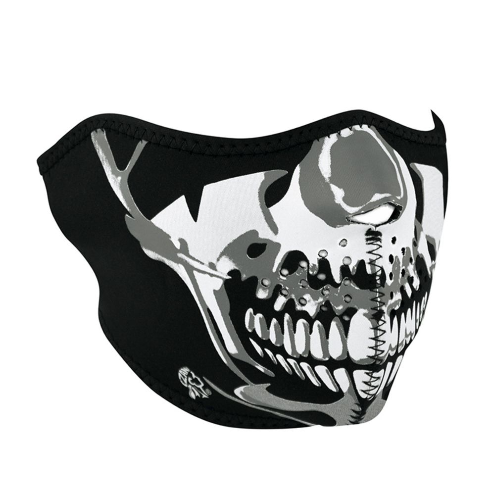 The ZAN Headgear Neoprene Half Face Mask features full coverage of the nose, chin, and cheeks with stretchy, warm and water resistant 2mm thick neoprene. Like most ZAN Headgear face masks it has a black stretch nylon trim for added durability and clean finish. A hook and loop closure allows for adjustability and ensures great fit, and can even be lengthened with our Neoprene Extension Piece (sold separately). Provides coverage of the ears, nose and cheeks from the elements. Can be used with or without a helmet. One size fits most. Chrome Skull design, reversible to Black.