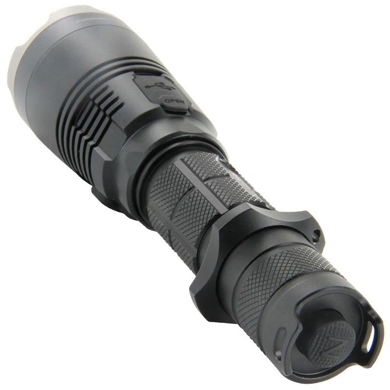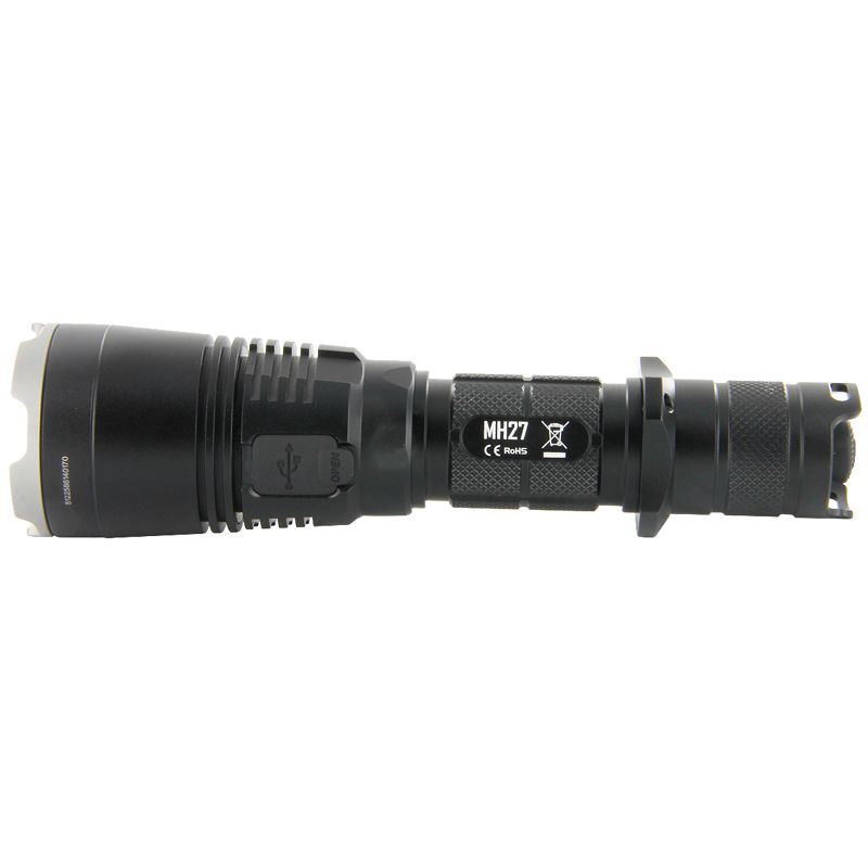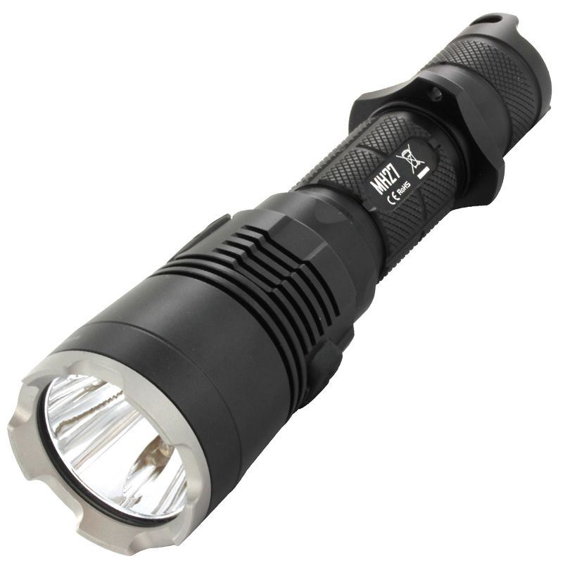 The Nitecore MH27 1000 Lumen flashlight is a compact, versatile device designed for military and hunting use. Along with its 4 brightness levels, the MH27 features three secondary auxiliary red, green, and blue LEDs that can be used in various critical situations from crowd control to blood tracing. The integrated advanced temperature regulation technology and reverse polarity protection keeps the flashlight safe from internal overheating and impact. It can run on a rechargeable 18650 li-ion battery, and the included micro USB port also allows for recharging without removing the internal battery.