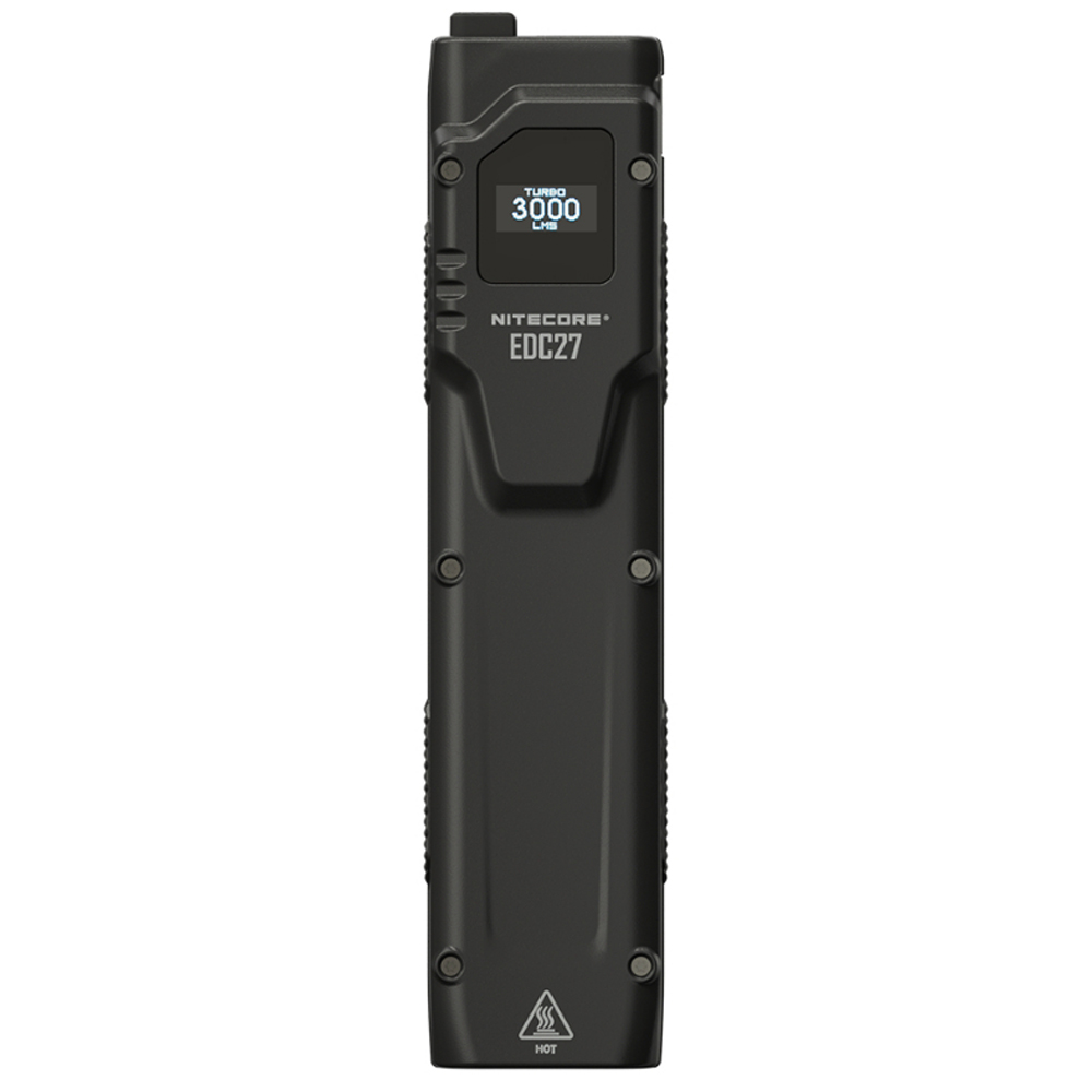 The Nitecore EDC27 torch has a maximum output of 3000 lumens from the 2 x Luminus SST40 LEDs and is powered by a built-in 1700mAh li-ion battery. The light is rechargeable via USB-C and includes a USB charging cable. Proximity sensor detects obstructions close to the LEDs and adjusts the brightness to prevent overheating.The beginning of a new flashlight revolution, the EDC27 offers a slimline, compact design with outstanding performance. The light offers five brightness levels and a strobe mode, all of which are operated by the dual switch user interface on the tail end of the torch.The torch is made from high strength stainless steel with a Physical Vapour Deposition (PVD) titanium coating and matte finish for resistance to scratches and fingerprints.The EDC27 features a multi-functional OLED display screen which provides real-time information on brightness levels, remaining runtime, battery voltage and lockout mode. To prevent accidental activation, the torch has a half and full lockout mode which display as either 1 or 2 respectively, on the screen.