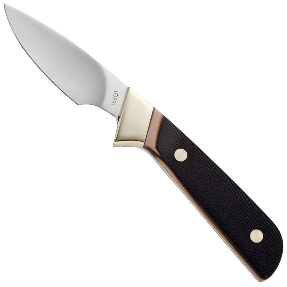 Old Timer Lil’ Finger Full Tang Fixed Blade Knife, 7Cr17 High Carbon Stainless Steel Drop Point Blade, Old Timer Sawcut Handle Slabs, Nickel Silver Bolsters, Lanyard Hole, and Brown Leather Belt Sheath.