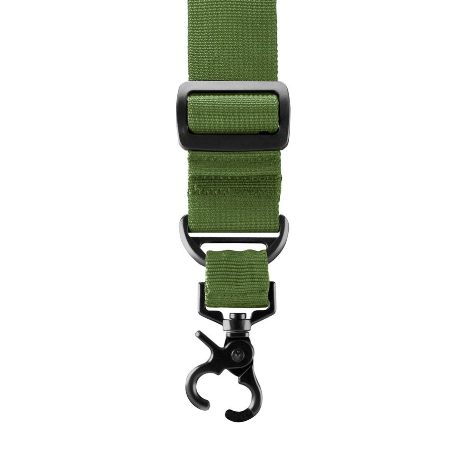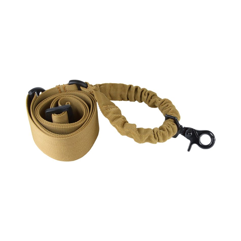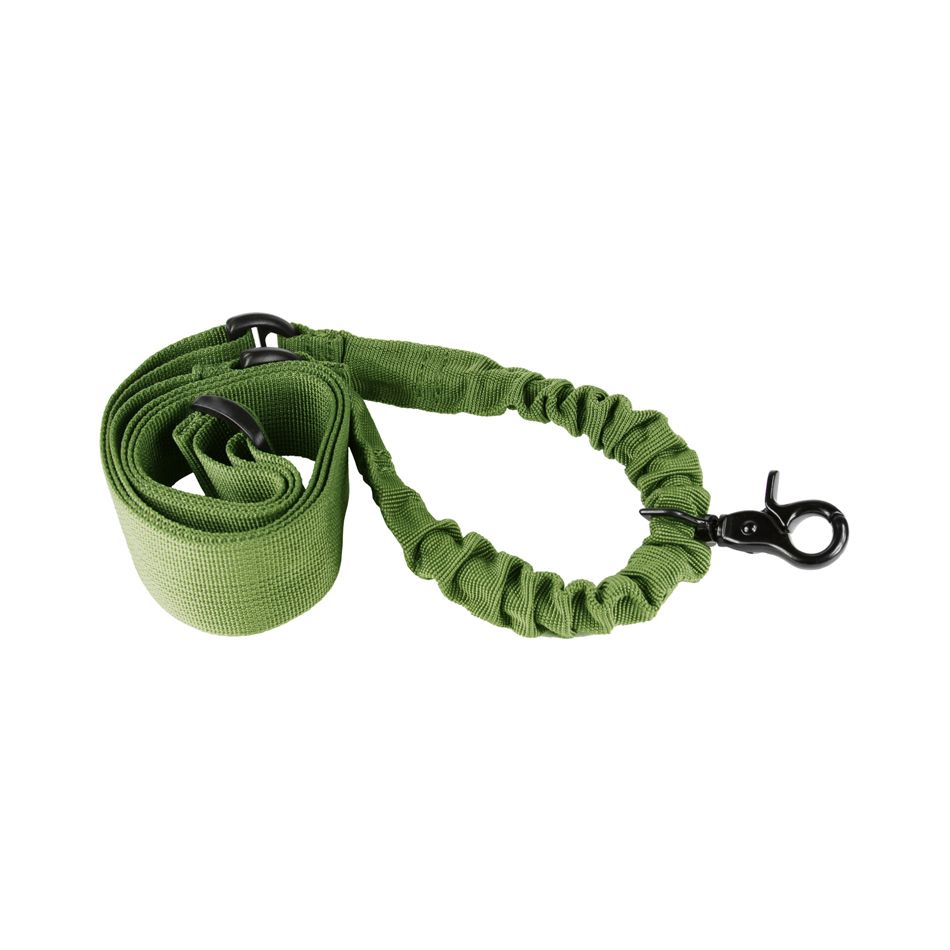 Fully adjustable single point sling for tactical rifles. Clasp type hook is held secure by spring tension. High density elastic material supports up to 150 lbs.
