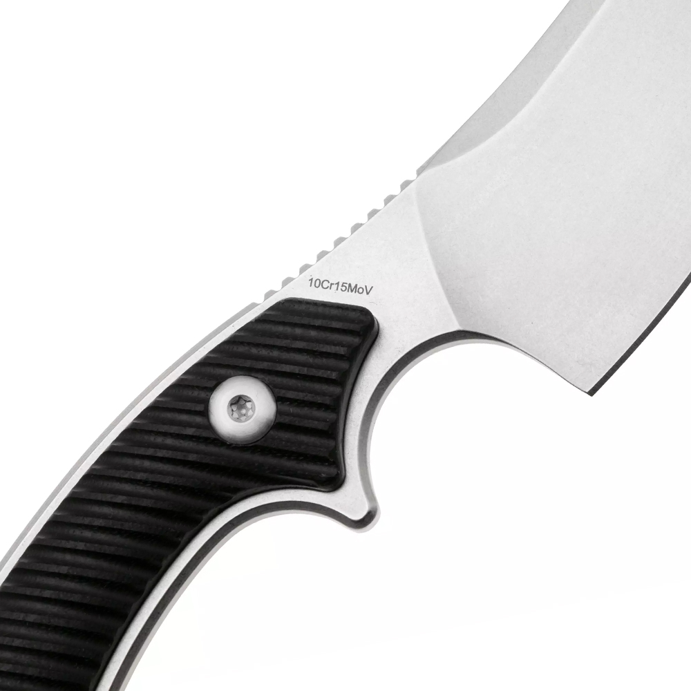 - Sharp 10Cr15CoMoV steel blade with a plain edge and secondary V-edge grind.