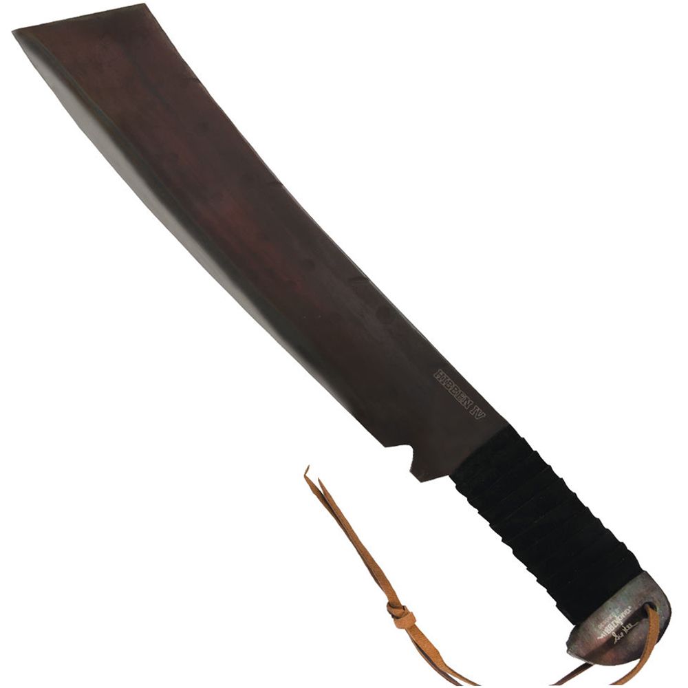 This is the machete that everyone is still talking about! Another exceptional example of craftsmanship from master knife maker Gil Hibben, this machete was designed for Sylvester Stallone’s Rambo character to be used in the hit motion picture Rambo, and was also featured on the cover of Blade Magazine. Crafted of one solid piece of 1090 carbon steel, this machete is heat-forged and honed to a razor-sharp finish, providing the chopping and slicing power needed in a quality machete like this one. The heat-forged construction of the blade creates a unique, weathered finish for an eye-catching and appealing look as well as durability that will withstand tough use. The handle of this massive blade features black cord wrappings for the secure, comfortable grip you need in a machete of this caliber. Included in the handle is a genuine leather lanyard, which is handy for carrying as well as for utilizing the strength of this machete. Also included is a heavy-duty, genuine leather sheath to house the blade. The sheath features a large belt loop, making the machete convenient to carry or transport. The heavy-duty construction of the sheath keeps the blade secure so you don’t have to worry about it slipping or slicing through the sheath. Measuring a staggering 16 1/2" overall, this machete was designed to be tough enough for Rambo, and it is surely tough enough for any job you need it for, too. The heavy construction, combined with the thoughtful finishing touches and accents, makes this machete both functional and visually pleasing, giving you a blade that will stand the test of time and be used and enjoyed for generations. Includes certificate of authenticity.