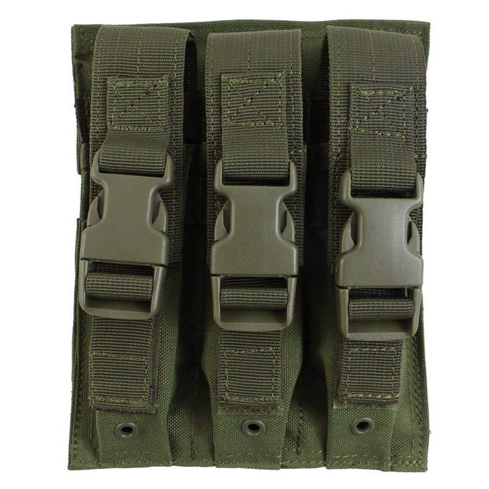 This Raven X magazine pouch can hold up to three MP5 or extended pistol mags at one time. Each slot has a hook and loop closure as well as a quick-release buckle for extra security. The back of the pouch is equipped with PALS straps for attachment to bags, belts, vests, or other MOLLE compatible gear. This model is low-profile and non-reflective.