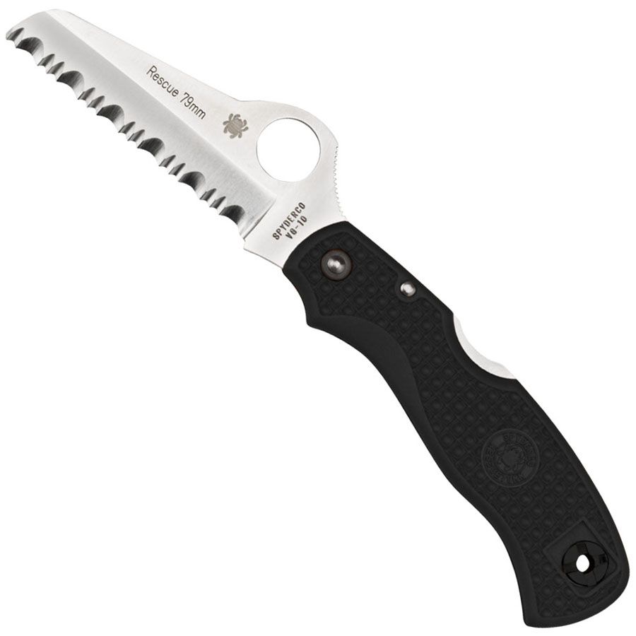 A smaller equivalent of the C14 93mm Rescue, it too has a flat saber-ground, SpyderEdge, VG-10 blade that ends in a sheepfoot safety tip. For smoother thumb rotation we enlarged the Spyderco Trademark Round Hole, which in turn creates a prominent hump to position the thumb on while cutting. The FRN waffle textured handle is available in indigo blue, black and safety orange with an ambidextrous, tip-up pocket clip.