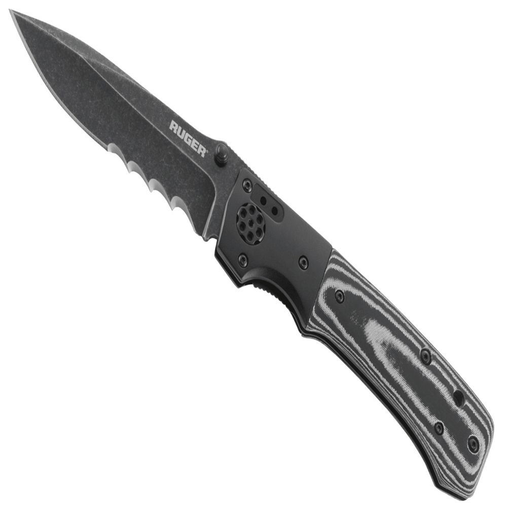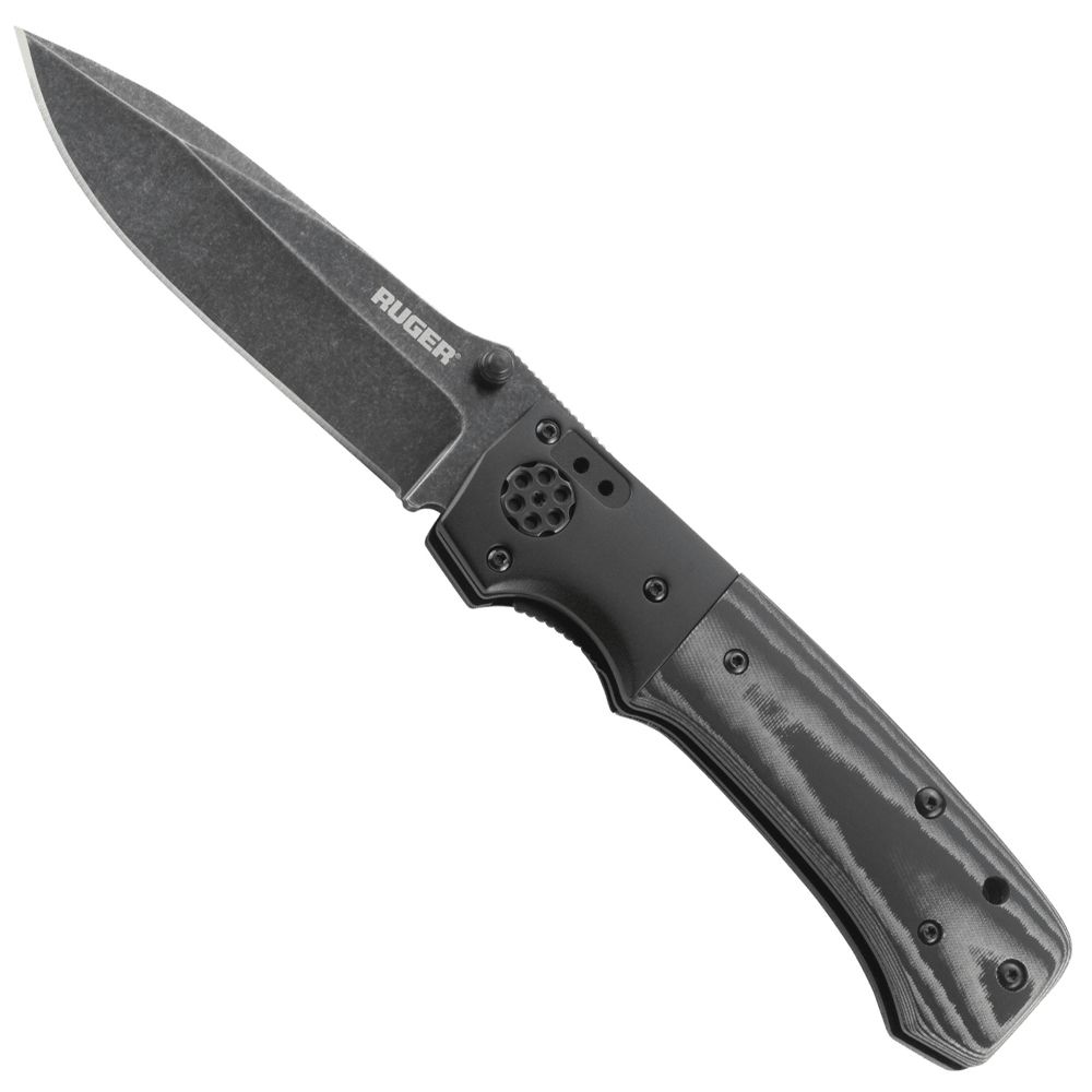 The All-Cylinders folding knife with locking liner and thumb studs comes fully loaded to ride along with any Ruger® firearm; featuring a black, stonewashed drop-point blade; machined G10 handle; unique, “revolver cylinder-style” pivot point; and 2-position clip.