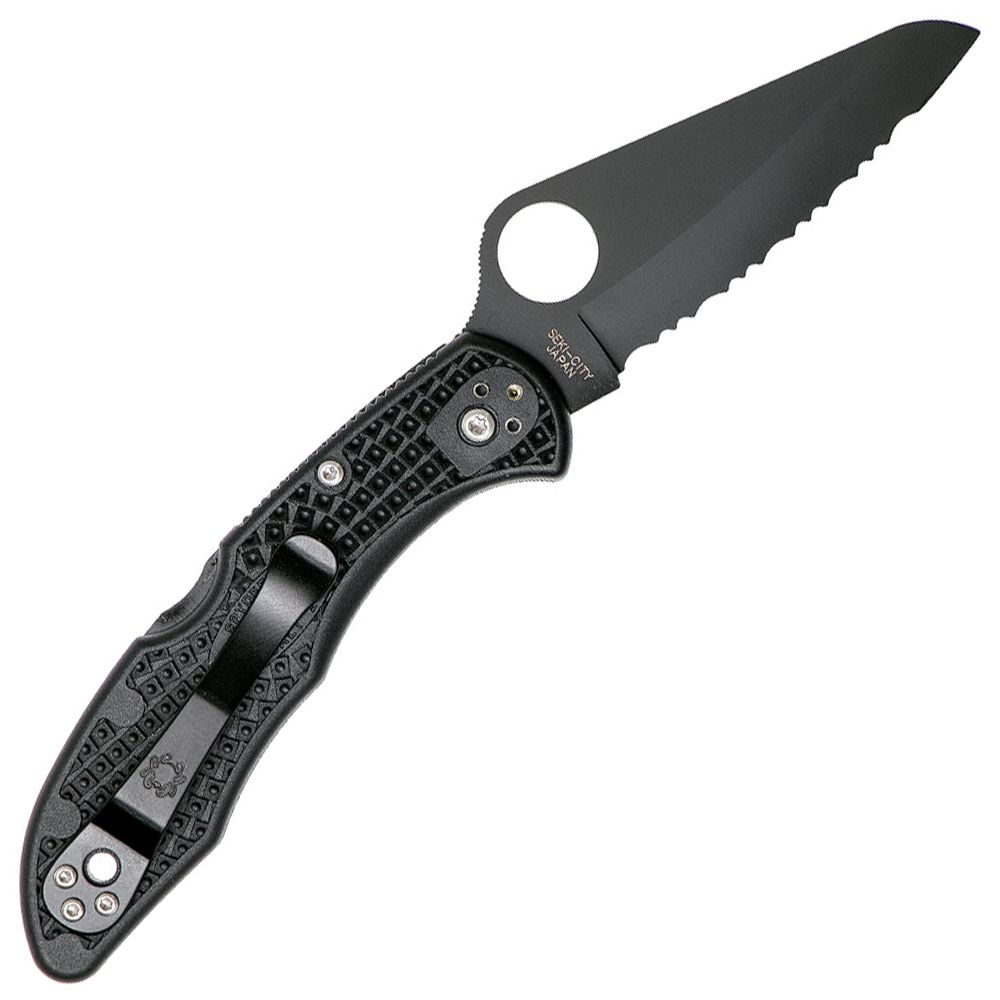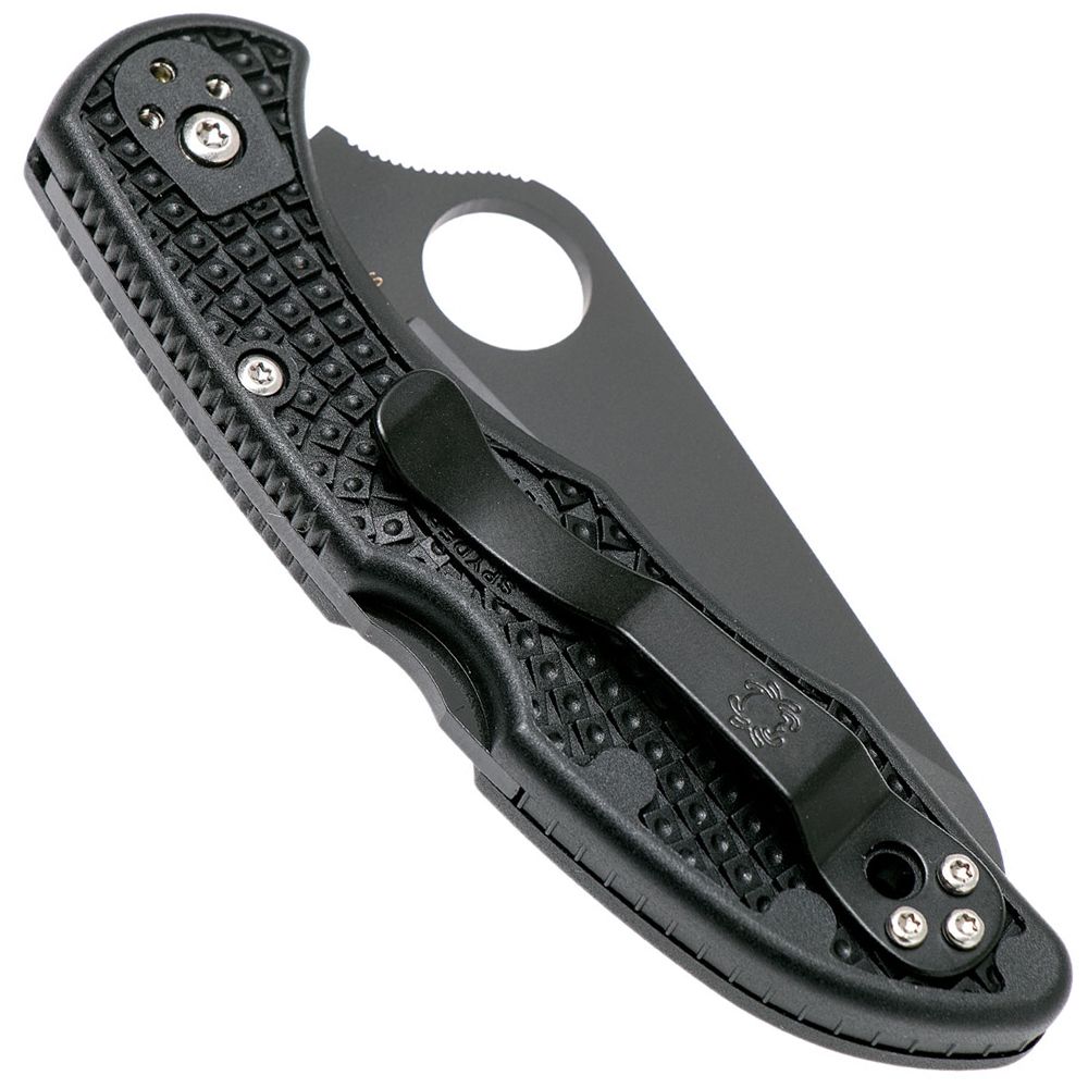 The Salt 2 Black Blade features a hollow-ground H-1 blade cloaked in a non-reflective black titanium carbonitride (TiCN) coating that makes it ideal for use in tactical environments where light discipline is a concern. Available with a choice of Plain Edge or fully serrated Spyder Edge cutting edge, the blade includes a fully accessible Trademark Round Hole for swift, ambidextrous, one-handed opening. The blade is supported by a high-strength back lock mechanism housed in an ultra-lightweight linerless handle. Patterned on the time-tested design of the Delica 4, the handle is injection molded from tough fiberglass-reinforced nylon (FRN) and features refined ergonomics and a high-traction Bi-Directional Texturing pattern that ensures a secure grip in even the most demanding conditions. Four sets of threaded stainless steel inserts molded directly into the handle provide a solid foundation to mount the knife’s black-coated titanium pocket clip for tip-up or tip-down carry on either side of the body. Lightweight, low-profile, and completely rustproof, the Salt 2 Black Blade is ready for anything
