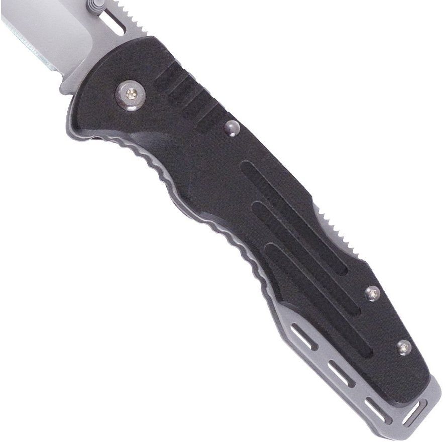 For our first Fusion tactical folder we wanted something that was progressive and performance driven. The Salute is an acknowledgment that great design can still be affordable with a little perseverance. Take the machined G10 handles in combination with scalloped full-length steel liners for a whole new look. Add a big lockback, smooth as silk operation, and a proven Bowie style blade. For good measure, throw in our patent-pending new invention- a movable thumb stud so you can tailor the position to your own hands. We didn't forget to incorporate our trademark low carry bayonet clip either. The Salute lives up to its name and is worthy of carry on any front in the world... including your back yard.