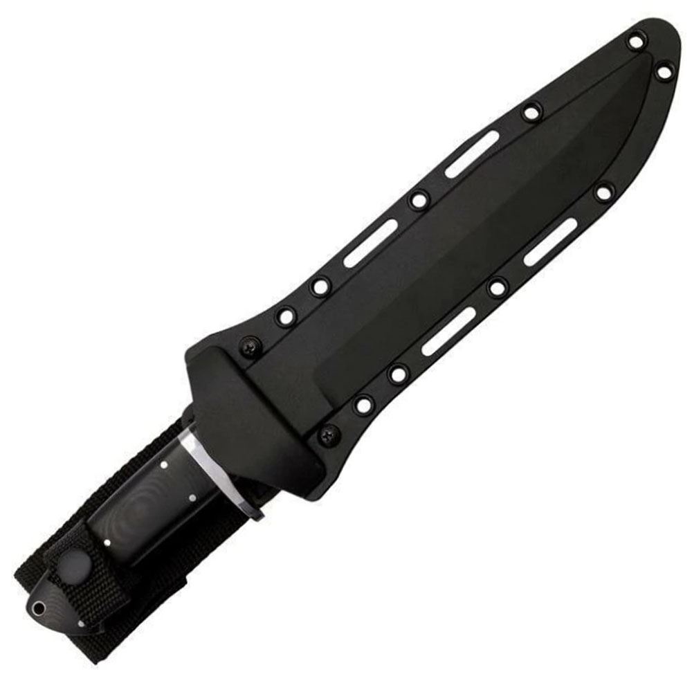 The VG-10 San Mai III® blade is perfectly heat treated and a double grind is expertly applied. Then the surface of the blade is polished to a beautiful satin finish and the edges are honed and buffed to hair shaving sharpness! The black G10 scales are fastened to the blade tang by 6 stainless pins and expertly hand shaped and contoured.This classic sub-hilt design fighter was first developed by Bob Loveless, one of the founding members of the knifemaker’s guild. It’s perhaps the quintessential combat knife.