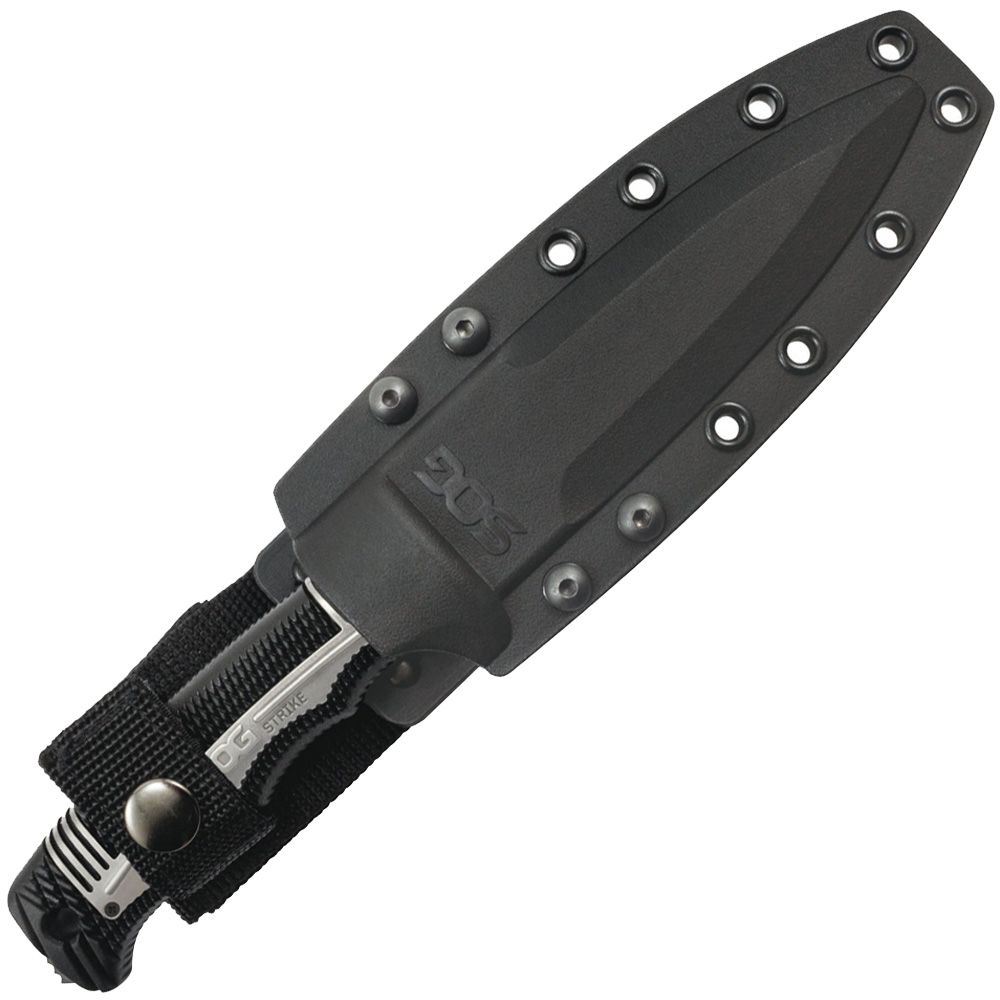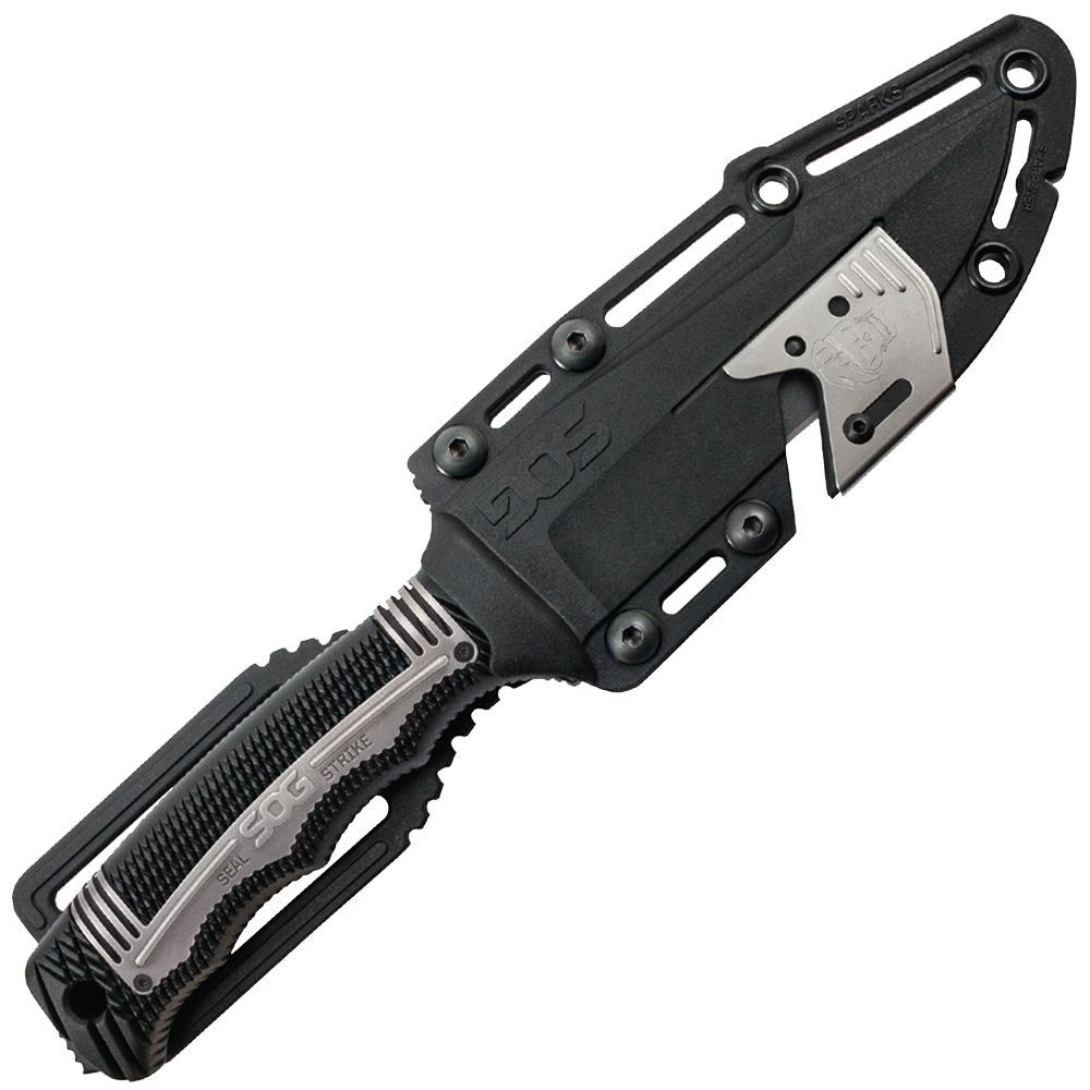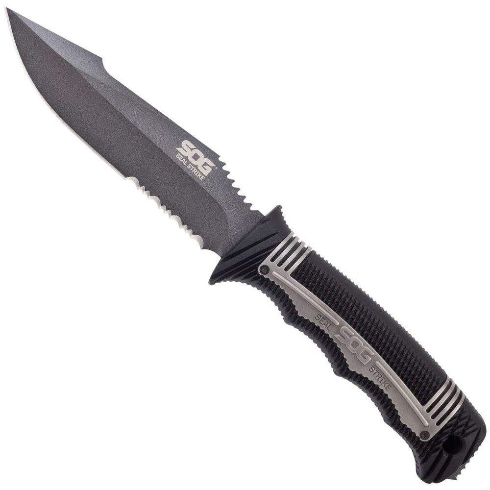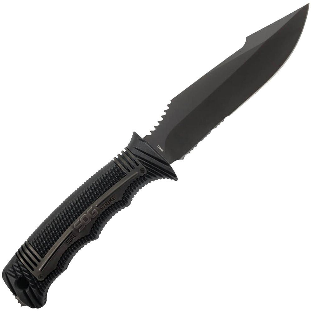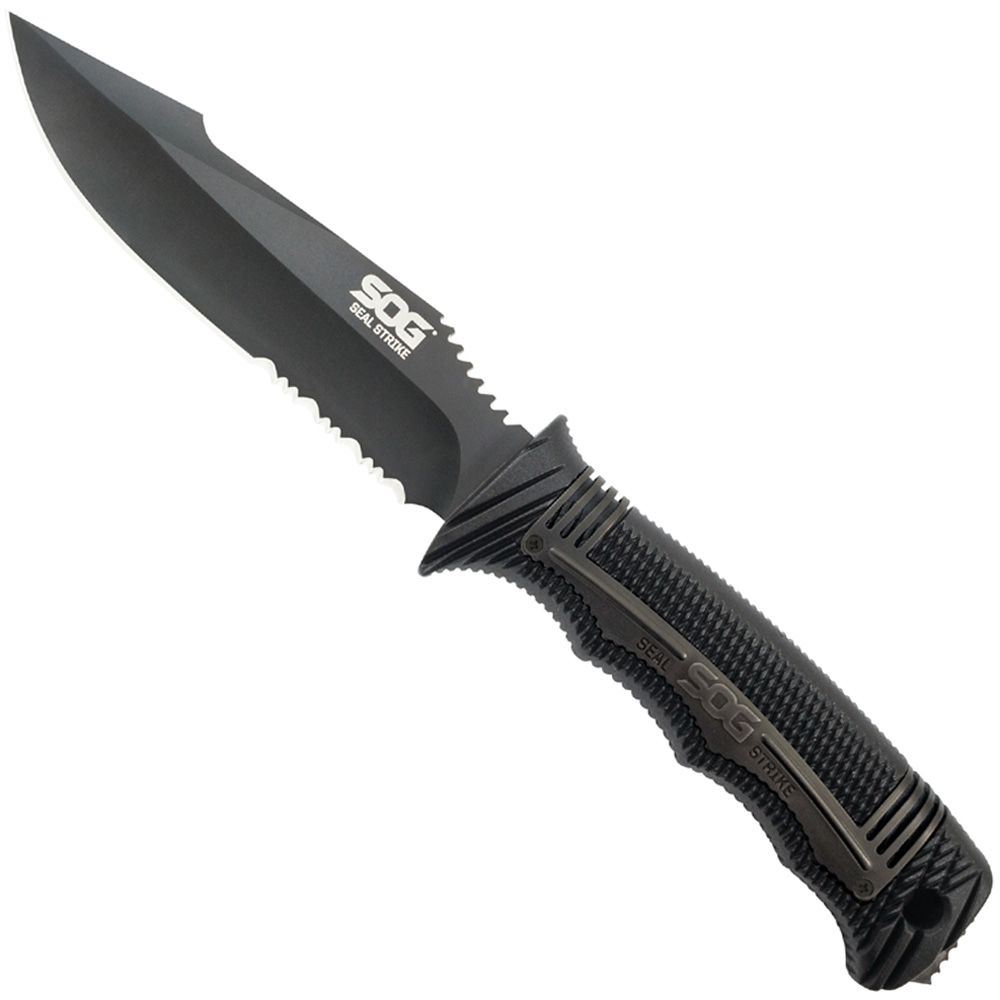 The newest member of the SEAL fixed-blade knife family, the SEAL Strike takes everything SOG has learned from years of real-world deployment and combines it into one spectacular package. This quality AUS-8 stainless steel, partially serrated blade is an excellent field companion for outdoor and underwater adventures. The SEAL Strike is serious business and carries on the tradition of supplying the world's elite military forces. It comes with a standard hard nylon sheath or a deluxe model with built-in cord cutter, single-stage sharpener, and larger attachment points. Be at the ready with the fully capable SEAL Strike.