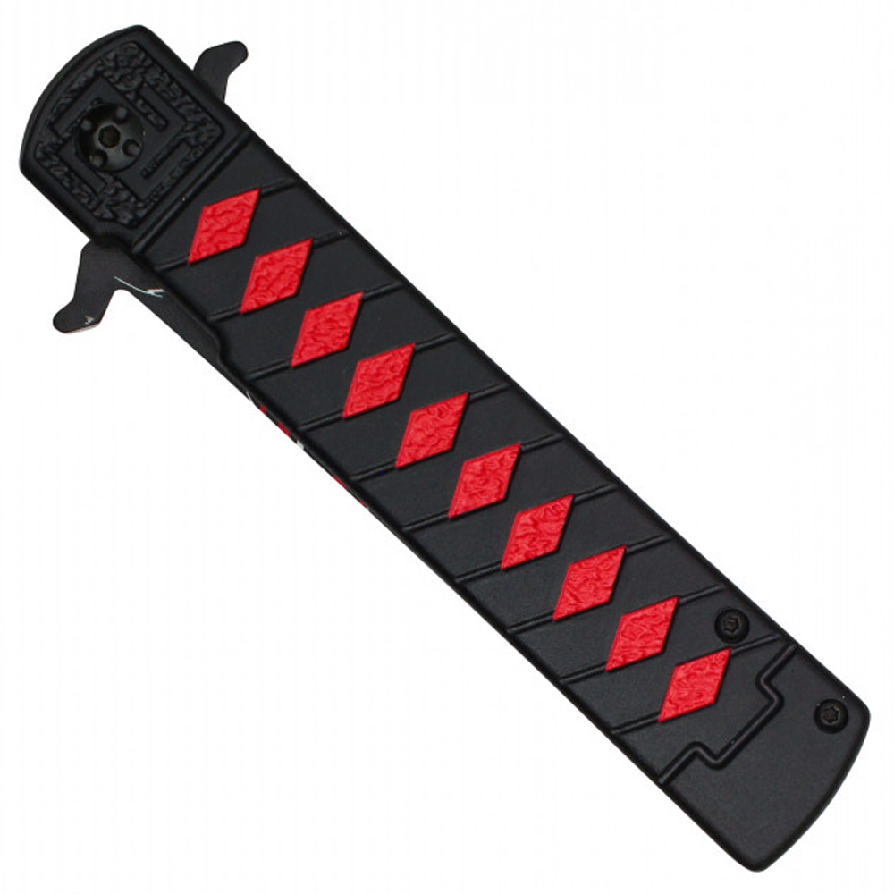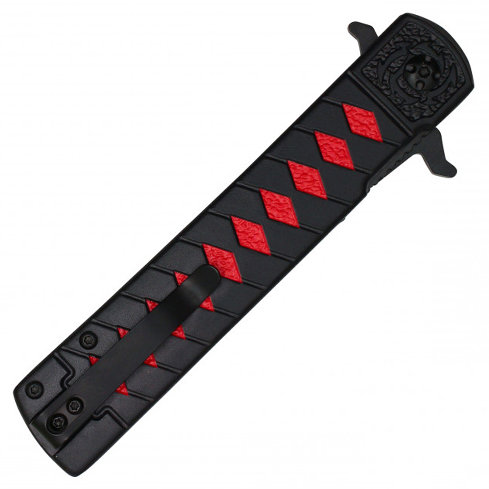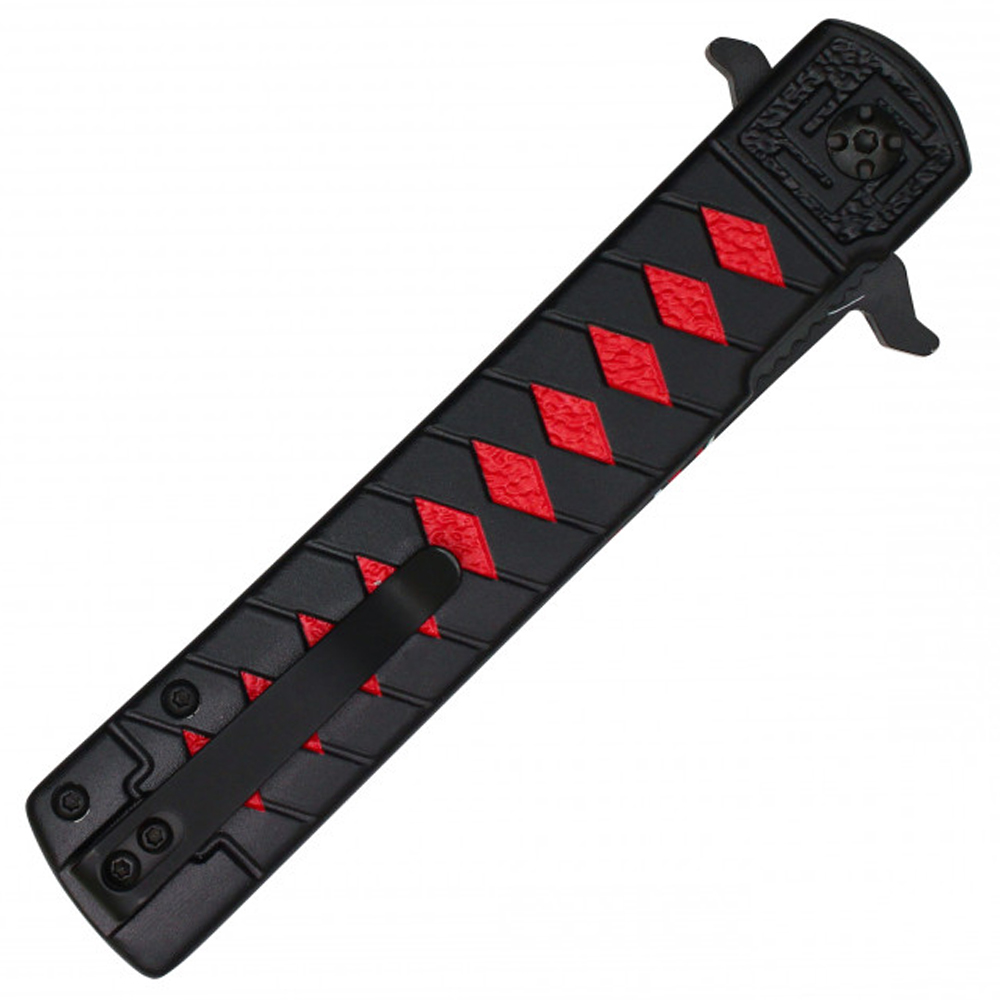 A 5-inch handle, inspired by the traditional katana grip, features a striking black and red color scheme for a secure and comfortable hold. Designed for versatility, it includes a belt clip for easy carry and offers a choice between a serrated/plain edge or a plain edge to suit different cutting needs.