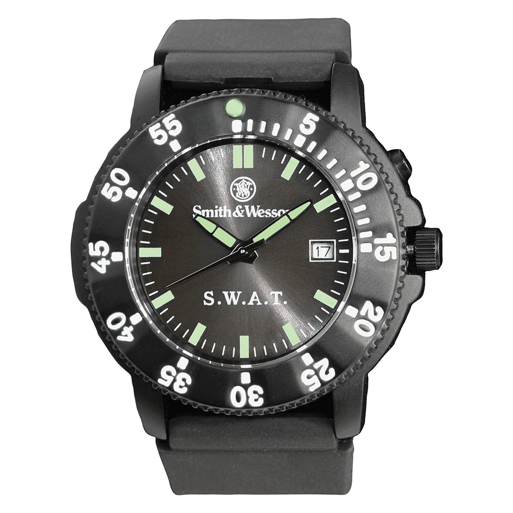 Smith And Wesson S.W.A.T. Watch delivers bold styling and dependable performance in a rugged tactical design. Featuring a round black face with the Smith & Wesson logo, this watch is powered by precision Japanese quartz movement for accurate timekeeping. Glow-in-the-dark hands and back improve visibility in low-light conditions, while the date display adds everyday practicality. Built with a tough stainless steel back, alloy case and bezel, and a scratch-resistant hardened mineral glass crystal, this watch is designed for durability. Finished with a smooth rubber wristband and water resistance up to 30 meters, it’s well suited for duty use or everyday wear.