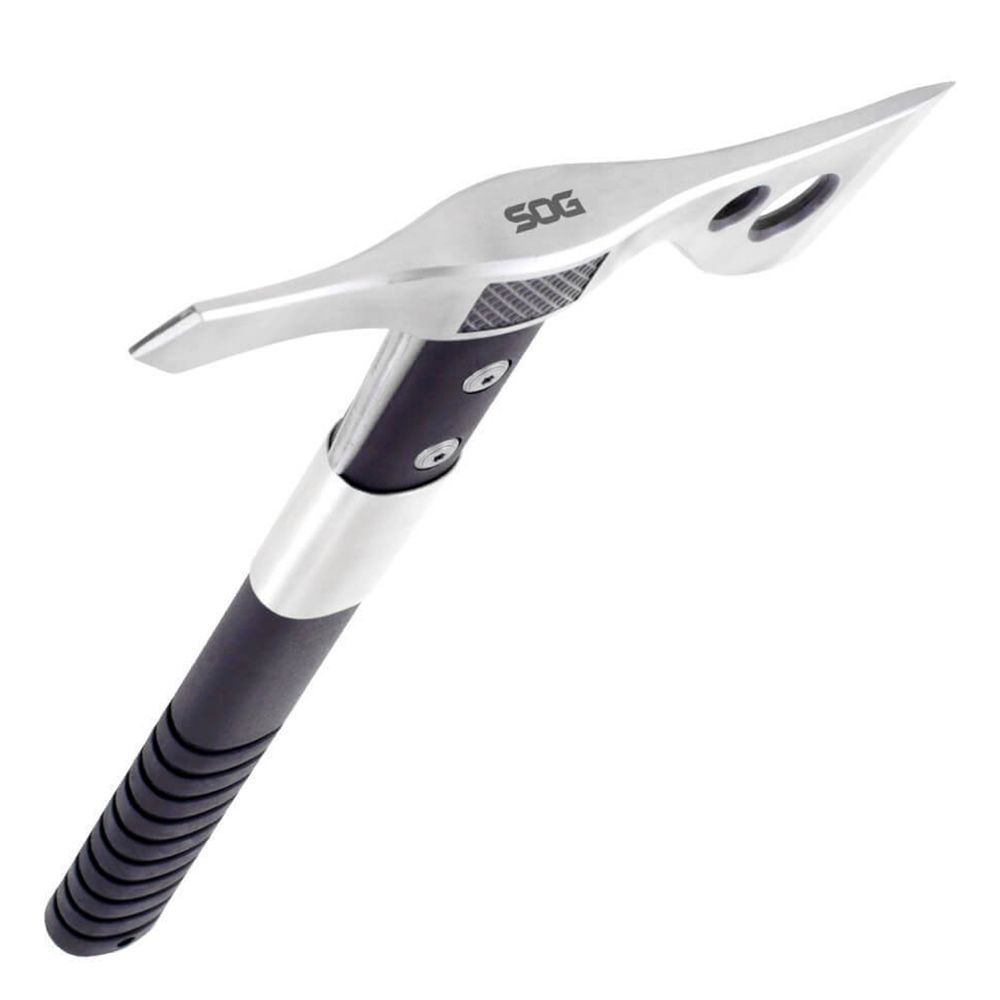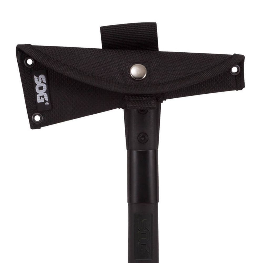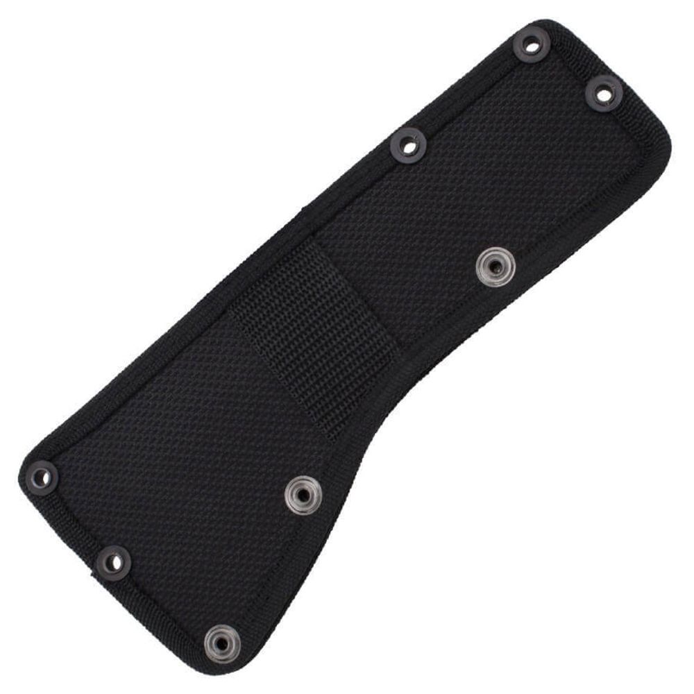 The 420 stainless steel head is mounted to the ballistic polymer handle with heavy-duty bolts and a steel ferrule to insure the strongest integrity. Side hammer checkering insures precision placement when swinging. Carried in a nylon sheath that can be mounted to belt, backpack, or gear. It is a universal tool for modern man.