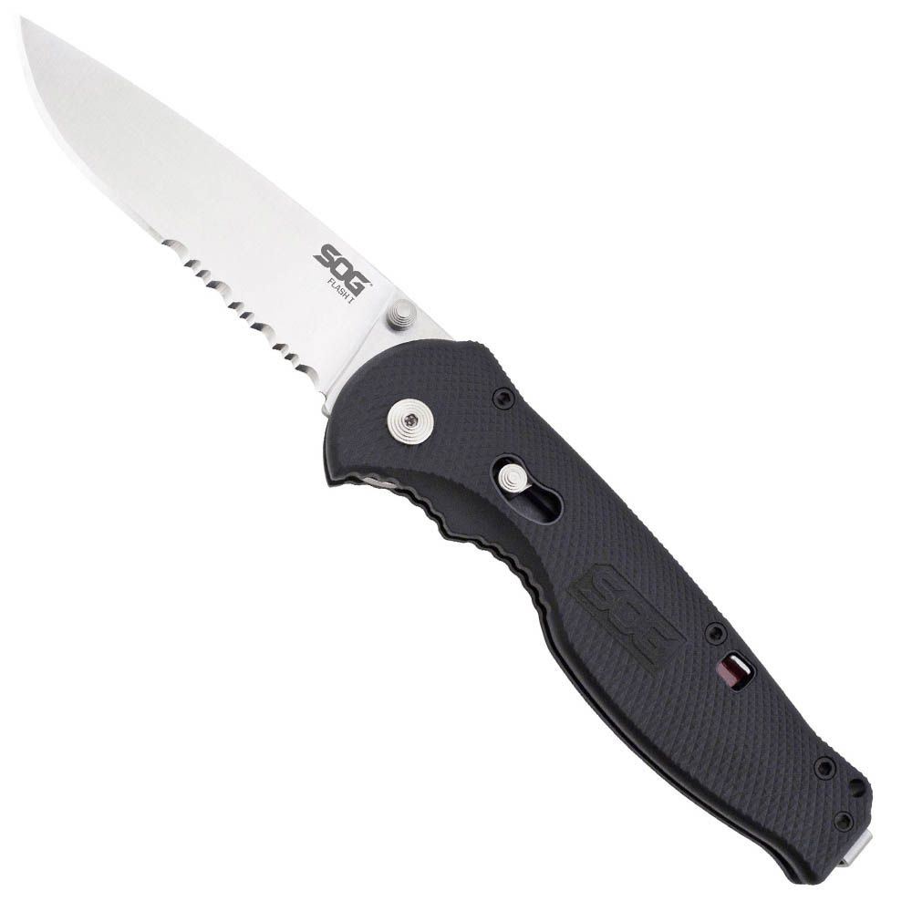 The Flash family of knives feature SOG Assisted Technology (S.A.T.), which employs a powerful piston lock that is easily released with a sliding button. The Flash II comes standard with glass-reinforced nylon (GRN) handle and black TiNi 1/2 AUS-8 serrated blade, clip, and pivot. All Flash knives come standard with SOG's patent pending, reversible bayonet mounted clip that ensures the lowest, most discreet carry possible. We also had the foresight to incorporate an additional safety lock that gives added security when the blade is closed.