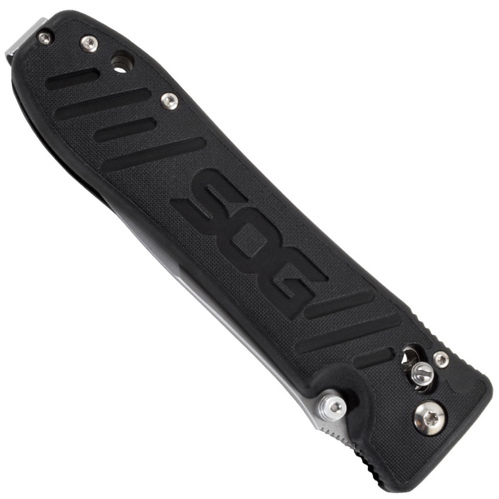 Go undercover with this stealthy tactical folder from SOG. The covert black handle, non-reflective bead blasted blade, and deep-pocket clip make it perfect for discreet everyday carry in your pocket, boot, or bag. The VG-10 blade has a versatile drop point blade and a stylish swedge to keep it light weight. The durable GRN handle is equipped with SOG’s exclusive arc-lock that provides rock-solid lockup and allows for a quick flick one-handed close.