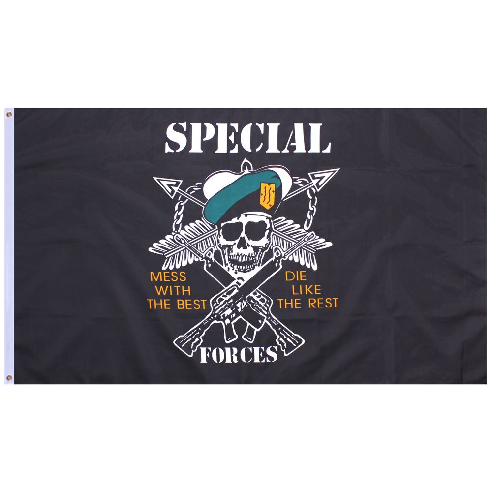 Let the Ultra Force Special Forces Mess w Best Flag soar in the wind with all its glory and valour from your flag pole. This flag comes with attractive monochrome style which is equally effective all the time. The fully black polyester material flag is 3 foot in length and is as wide as 5 foot. The flag displays traditional Special Forces logo with the great skull and guns design that strikes fear into the hearts of the enemies of Special Forces with immediate effect. The words-“Special Forces” is also printed on the flag in white where the word “Special” comes above the logo and the word “Forces” is positioned below it.