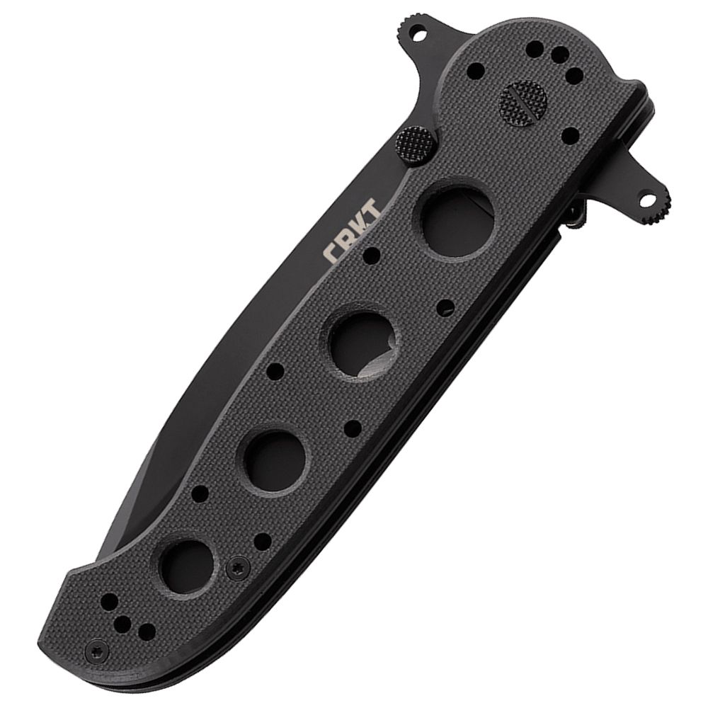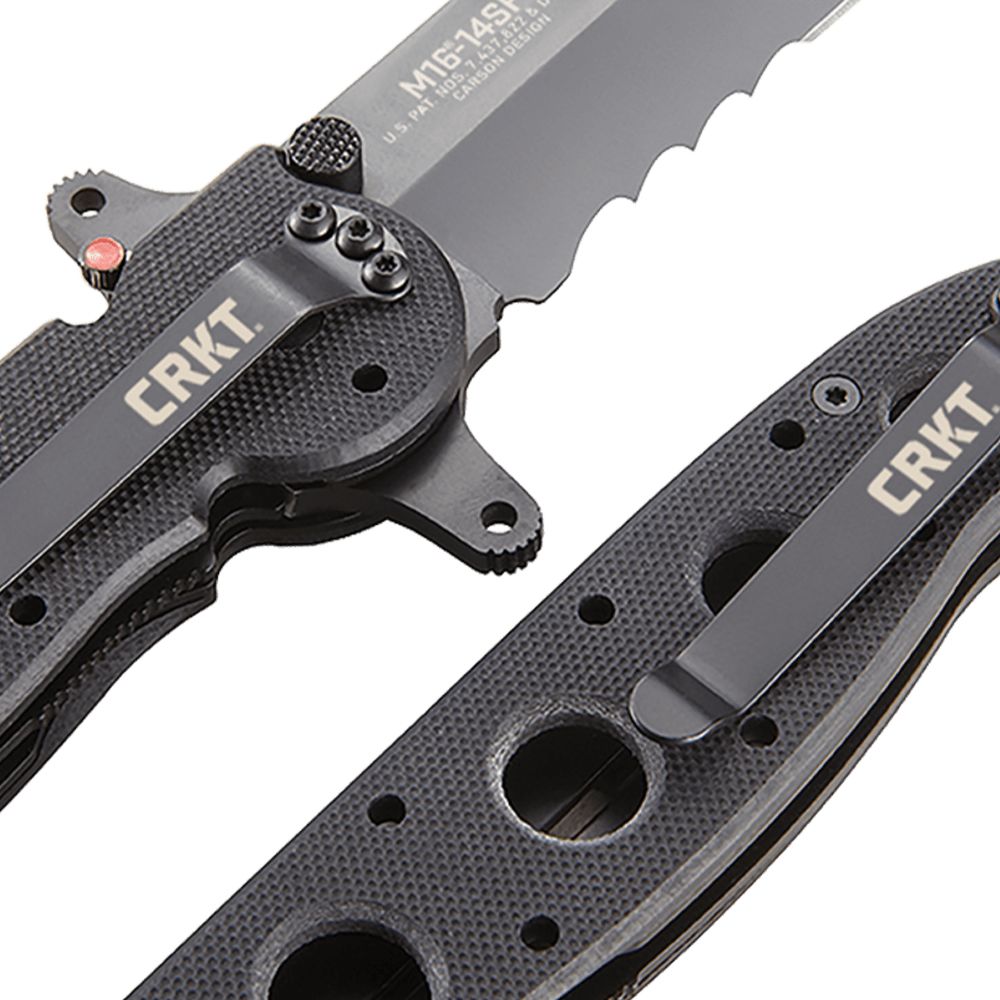 The Special Forces G10 models share a unique design offering a combination of Carson M16 Series features requested by military procurement specialists. The dual grind Tanto blades were specified because they offer maximum strength. The open build allows two Carson Flippers to be incorporated, resulting in a true hilt— very rare in folding knives. The M16-14SFG Big Dog G10 is our hefty utility version, with a 3.99" dual grind Tanto blade and full-size handle with butt pommel. Blade, frame and hardware are non-reflective tactical black. The blade receives a black titanium nitride coating for maximum corrosion resistance. Kit's trademark dual checkered thumb studs are standard. One-hand opening and closing is quick and smooth. It also features our automated liner safety. Automated liner safety is the locking liner safety innovation taken to the next level. The automated liner safety sets a pin between the locking liner and the frame. This pin acts as an additional layer of safety, so the locking liner is less likely to disengage during use. To close the knife, pull the red buttoned safety lever back, slide the locking liner over, and fold the blade into the closed position. Want one of the most secure safety systems on the market? The choice is automatic.Our G10 model features scales of black G10, stainless steel liners with friction grooves, and a premium 8Cr14MoV stainless steel blade with our Combination patented (2) Veff Serrations. G10 is often preferred for its aggressive gripping texture, light weight and superior insulating properties. All knives in this series are equipped with clip options that allow four-position carry on belts or webbing. Caution: These knives are not designed for tip-up in-pocket carry. They are special knives, designed by the military for special forces use.